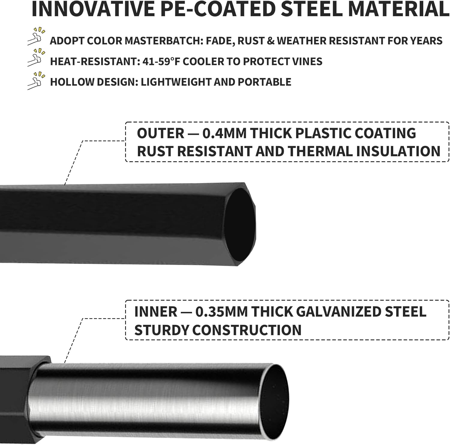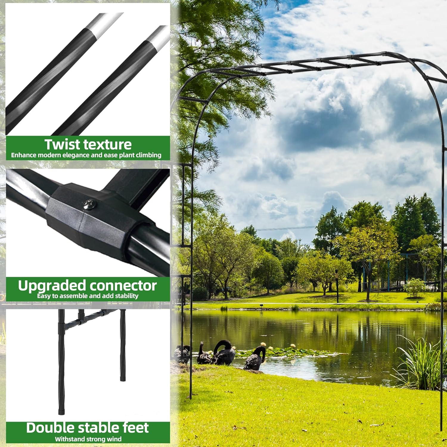 - PE-Coated Steel - Made with innovative PE-coated steel, this garden arch provides rust resistance, fade resistance, and thermal insulation. It reduces surface temperatures by 41-59Β°F, protecting climbing plants from heat damage and ensuring long-lasting use in outdoor environments.