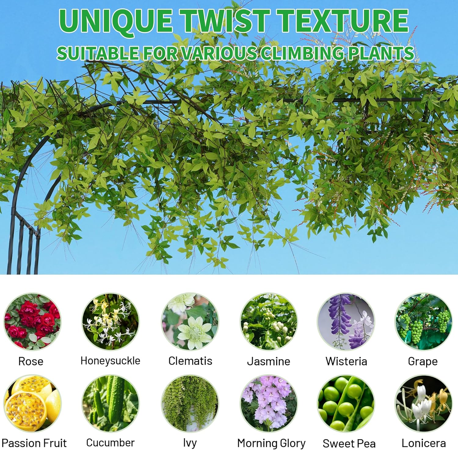 - Twist Texture Design - The full garden trellis features a unique twist texture that adds elegance to your garden. It offers sturdy support for climbing plants like roses, ivy, and vines while enhancing your outdoor decor with a stylish look.