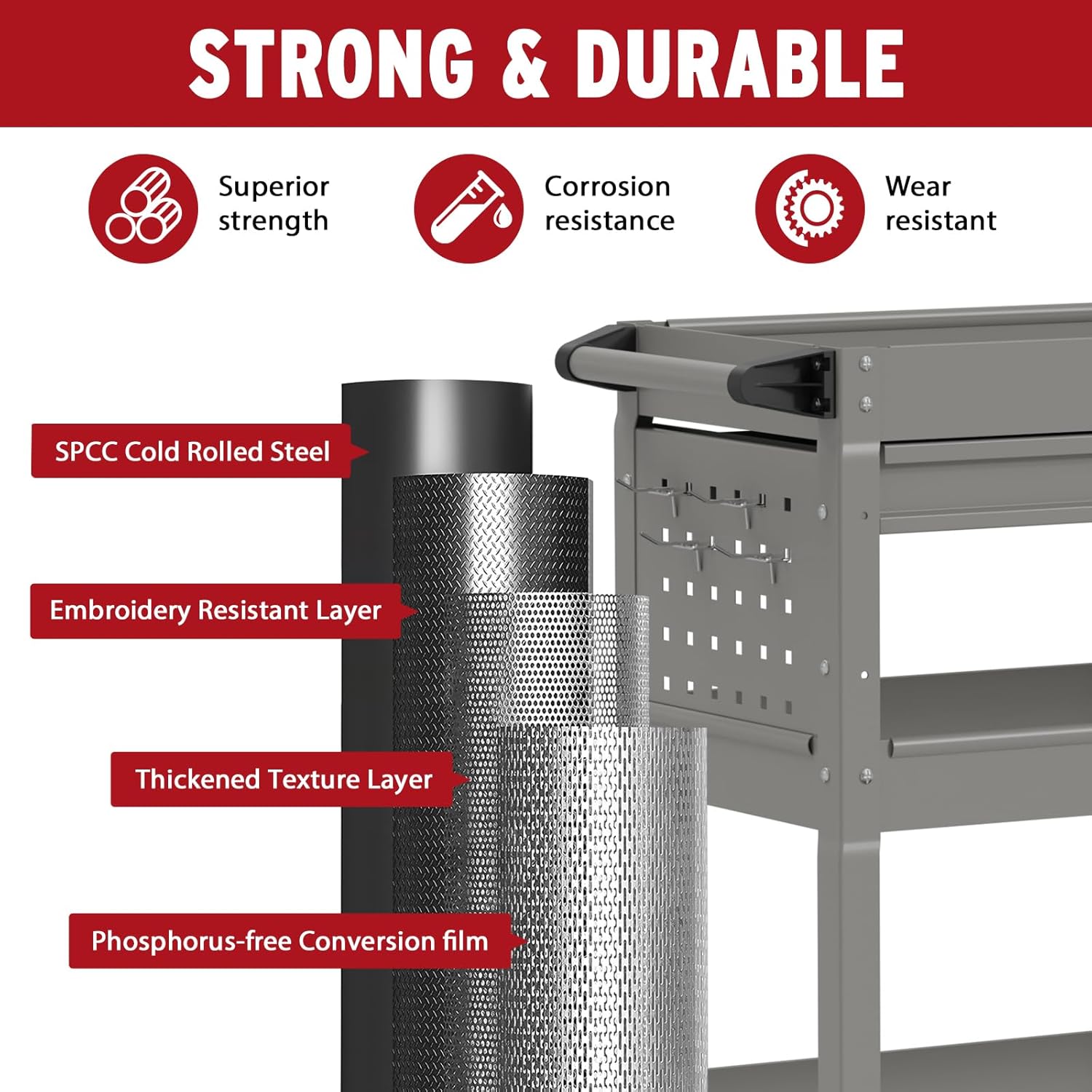 - Sturdy Construction: This tool cart with drawers is made of a high-quality cold-rolled steel plate with powder coated finished,which ensures its long-term use. Also its durable construction can withstand heavy loads.
