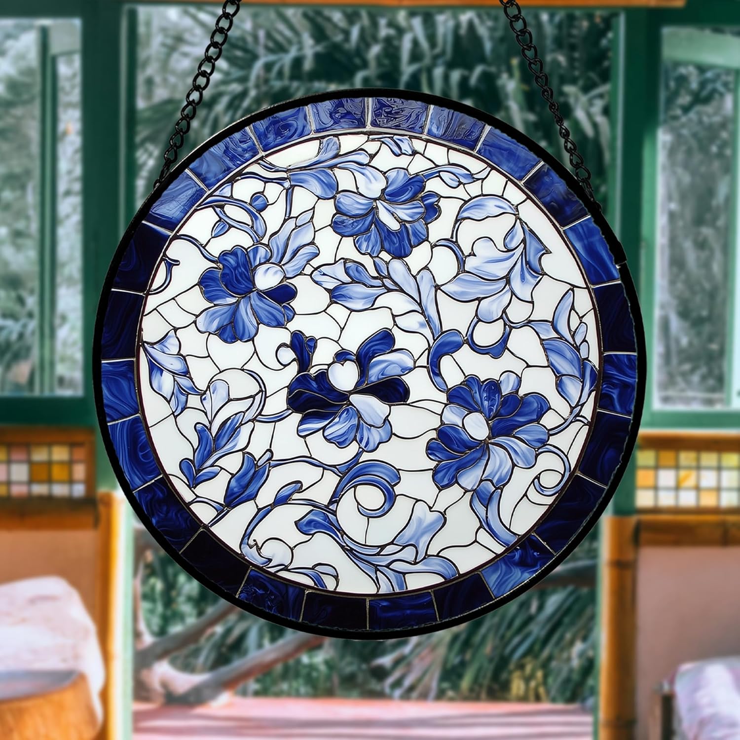 Stained Glass Window Hanging, Blue and White Abstract Flowers Sun Catcher for Door Home Decor Suncatcher Christmas Mother's Day Birthday Gifts for Women Men Mom and Nana 15 in