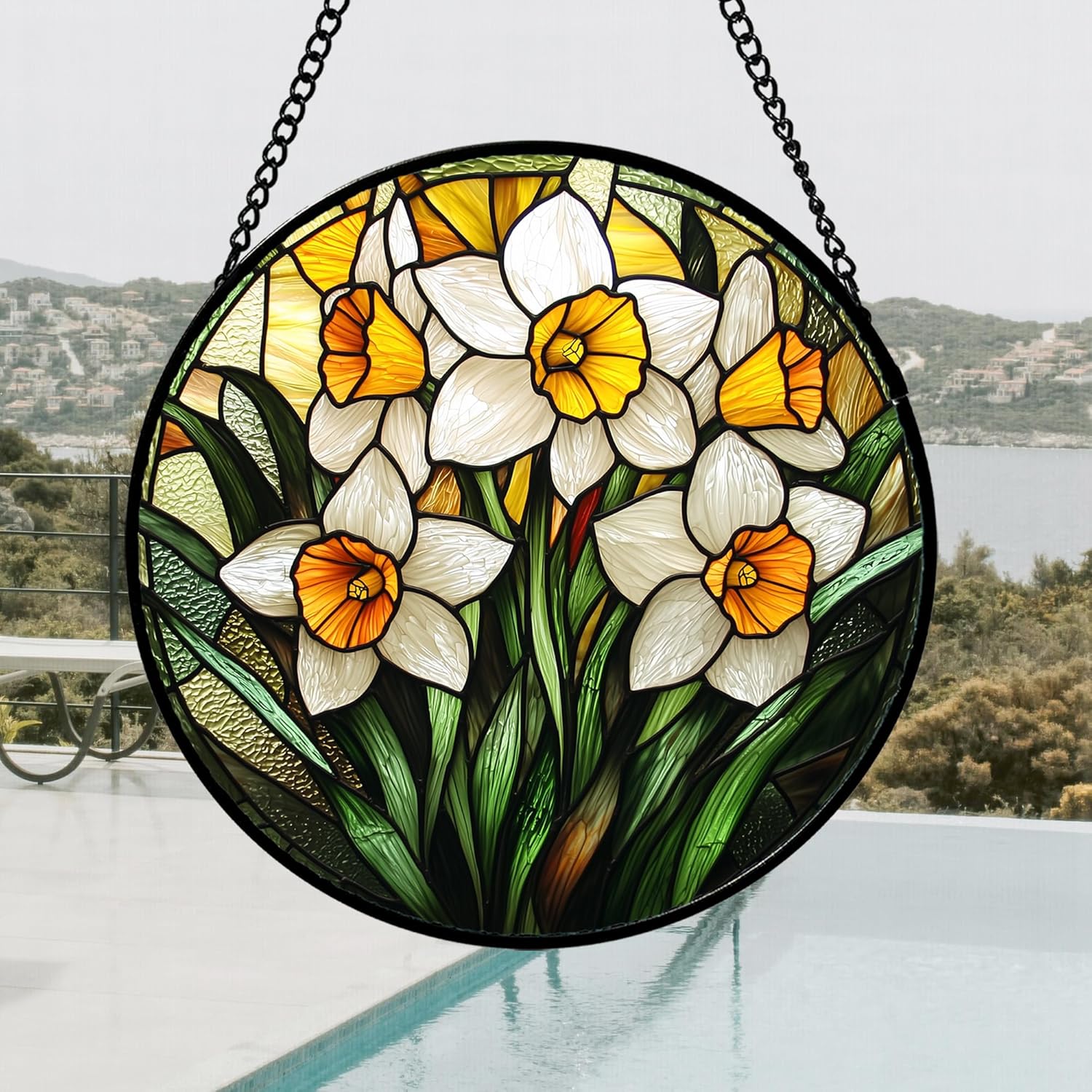Stained Glass Window Hanging, Yellow and White Daffodils Sun Catcher for Door Home Decor Plants Flowers Suncatcher Christmas Mother's Day Birthday Gifts for Women Men Mom Nana 6.3 in