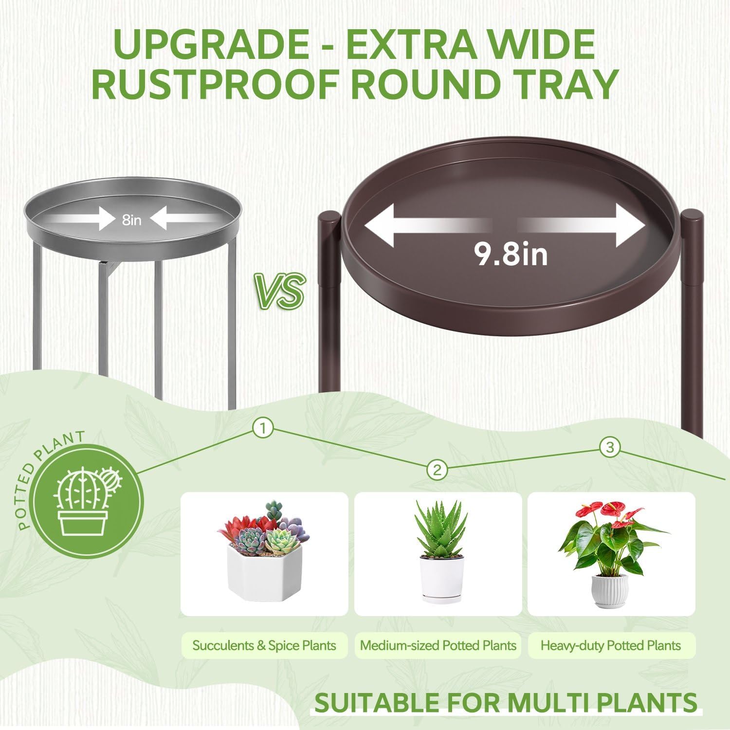 - 9.8 In Extra Wide Round Tray: This corner plant stands for indoor plants has been upgraded with an enlarged 9.8-inch diameter metal round tray with a total weight capacity of 138 lbs for large & heavy duty potted plants. The tiered plant stand is made of sturdy and durable iron with a waterproof and rustproof golden lacquer finish, making it suitable for indoor and outdoor use