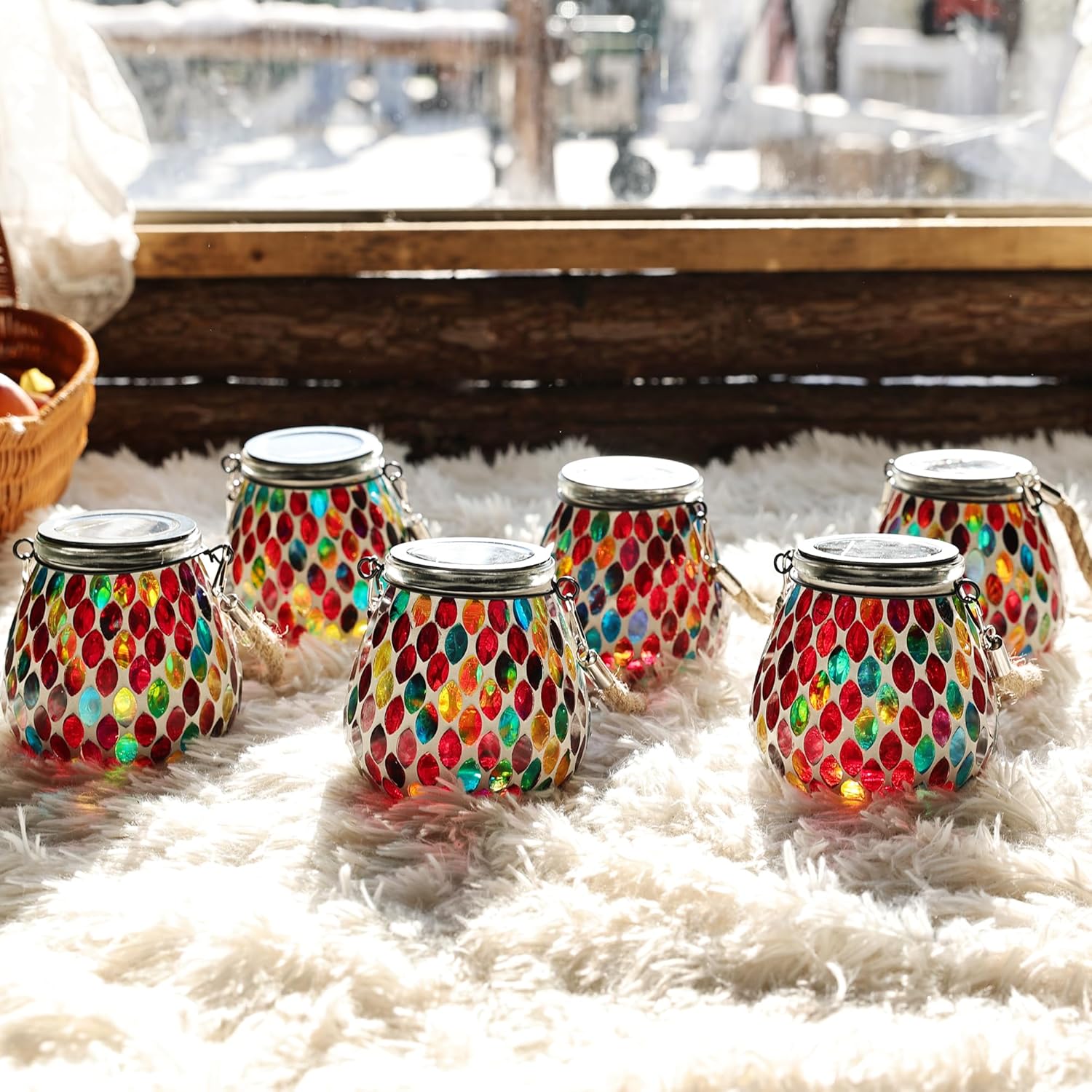 - 《Ruby Mosaic That Glows with Personality》Hand-placed oval mosaic glass tiles in rich red tones wrap around the entire lantern, creating a dazzling play of color. In the daylight, the glass refracts sunbeams like stained glass; by night, Passionate light shines through the mosaic to cast a vibrant, romantic glow in your garden.