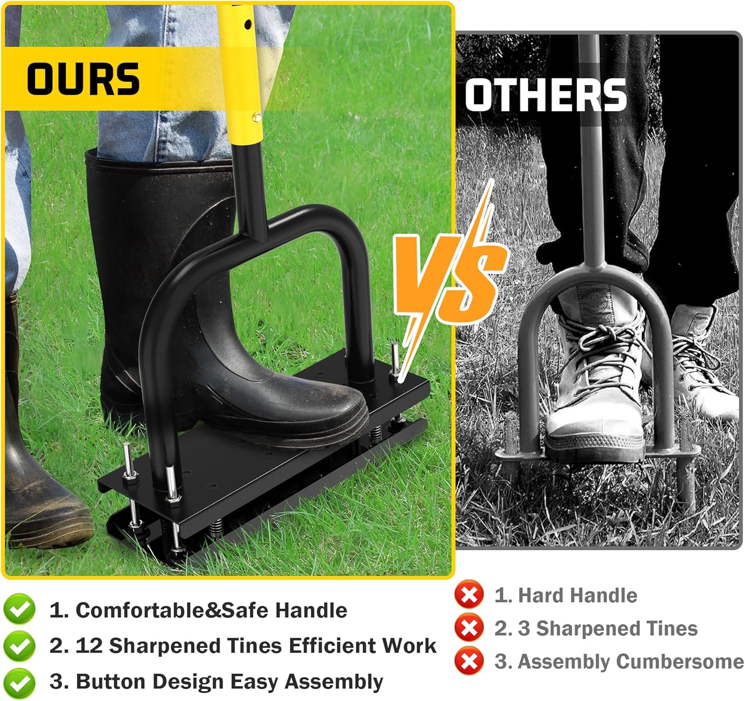 - 【Durable and Sturdy】The Lawn Aeration Gardening Tool is made of heavy-duty iron coated with rust-resistant powder and comes with a sturdy foot plate that holds your full weight, provides maximum downward force, and penetrates the soil easily to ensure safety and security