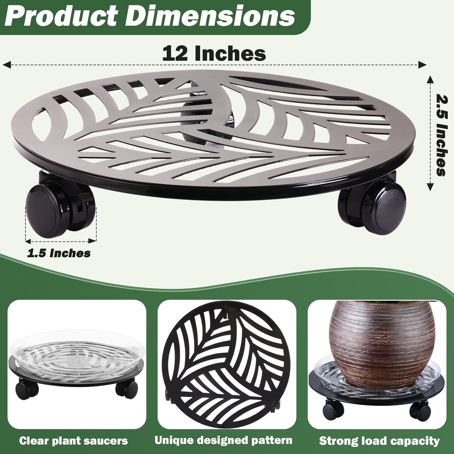 - Unique Leaf Pattern Design: The package will come to you with 5 packs of 12β large PU wheeled metal plant caddy, 5 packs of 10" clear plant saucers and a wrench, which the metal plant caddy is self-designed unique leaf pattern.