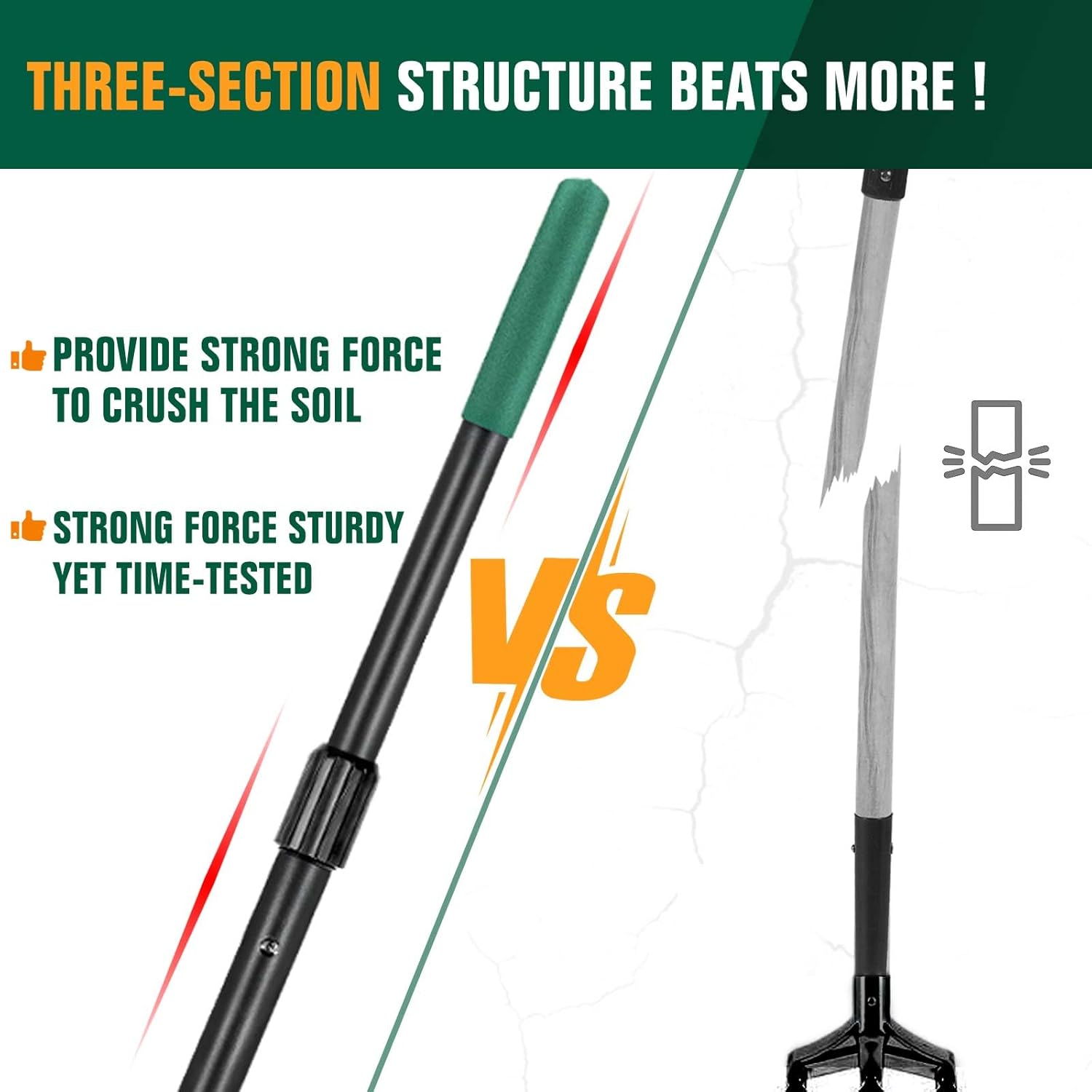 - REINFORCED&LONG-LASTING HANDLE BEATS MORE! ----- Built with solid steel and featured with reinforced 3-section designed, the handle of rotary cultivator tool ensure its sturdiness so it won’t bend after long-time use, the length are moderate, perfectly designed to fit your body, the extended handle of hand tiller cultivator won’t exhausted you after a long time working especially.