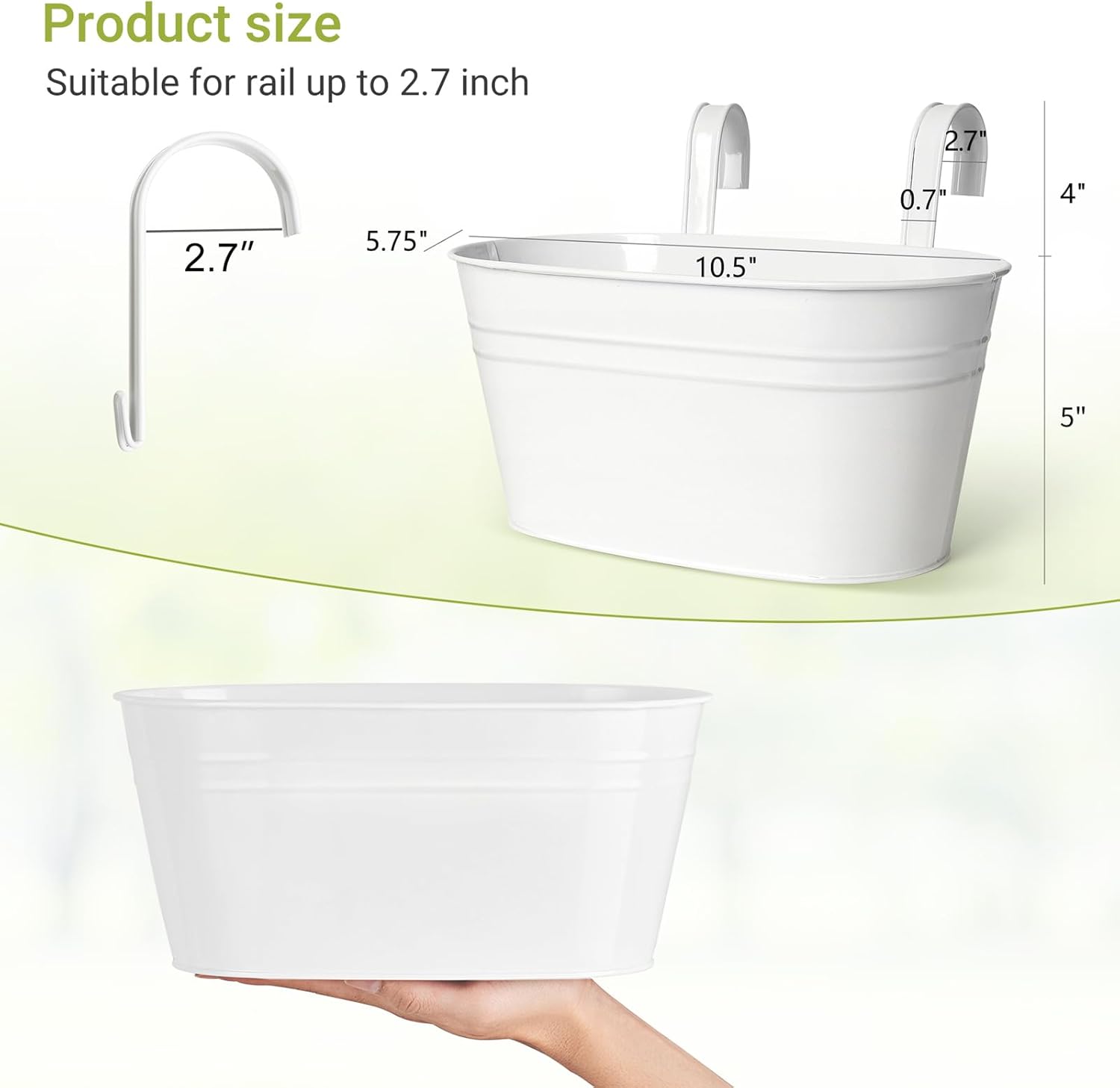 - Size:Planter:10.5" x 5.75" x 5". Hook is 4" x 2.7” x 0.7"(Suitable for rail up to 2.7 inch). Please check the size carefully before purchasing. Pay attention to:The hook is disassembled for transportation,you need to install the iron bucket yourself when it arrive