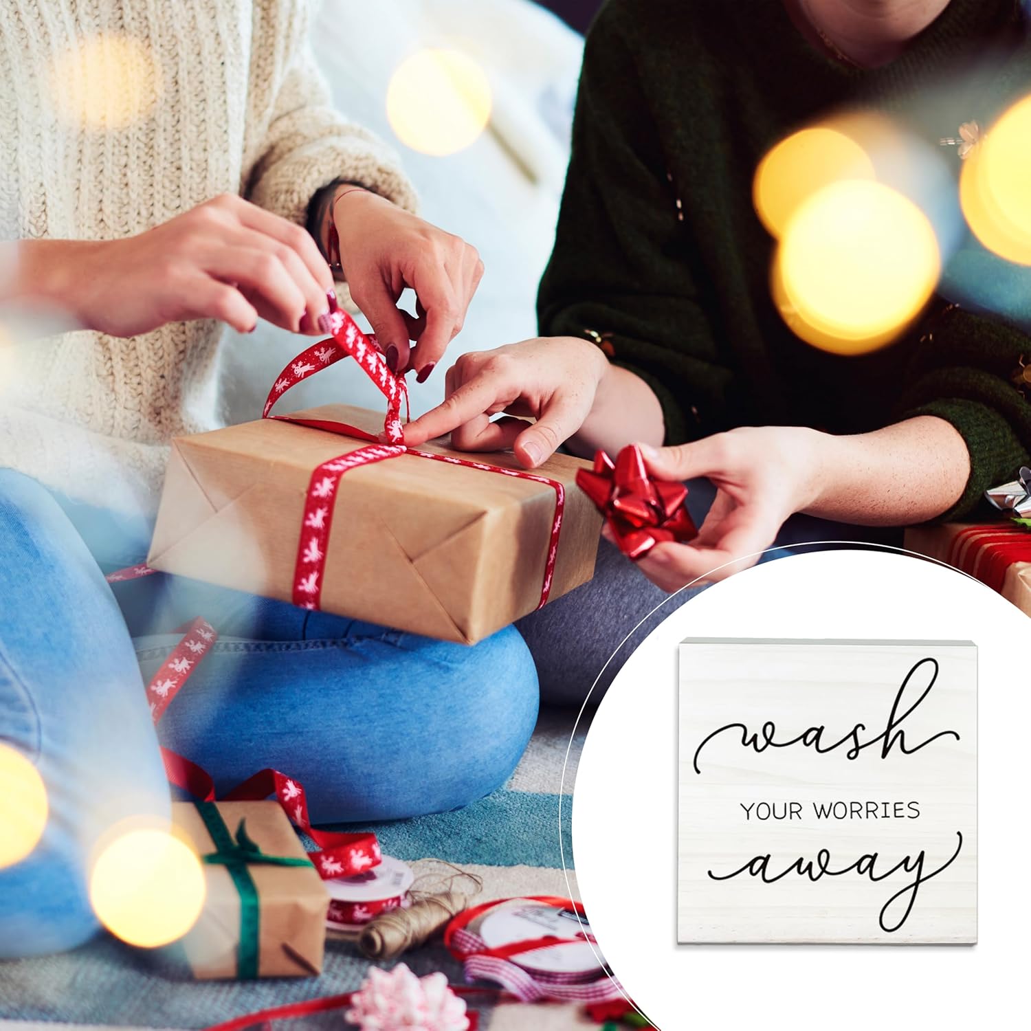 Funny White Wooden Sign-Wash Your Worries Away Block Plaque Desk Decoration-5x5 inches Inspirational Wood Block Gifts For Friends Family-Laundry Room Restroom Bathroom Tabletop Favors & Supplies-A09