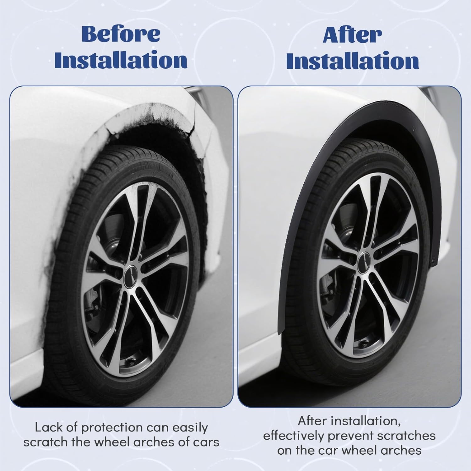 - 【Easy Installation】The soft rubber material allows for easy bending and shaping around the wheel arch, ensuring a seamless installation. No special tools are required, and you can complete the installation in minutes. This makes it a convenient option for DIY enthusiasts. The rubber edge trim also conforms well to the contours of the wheel well, providing a neat and professional finish.