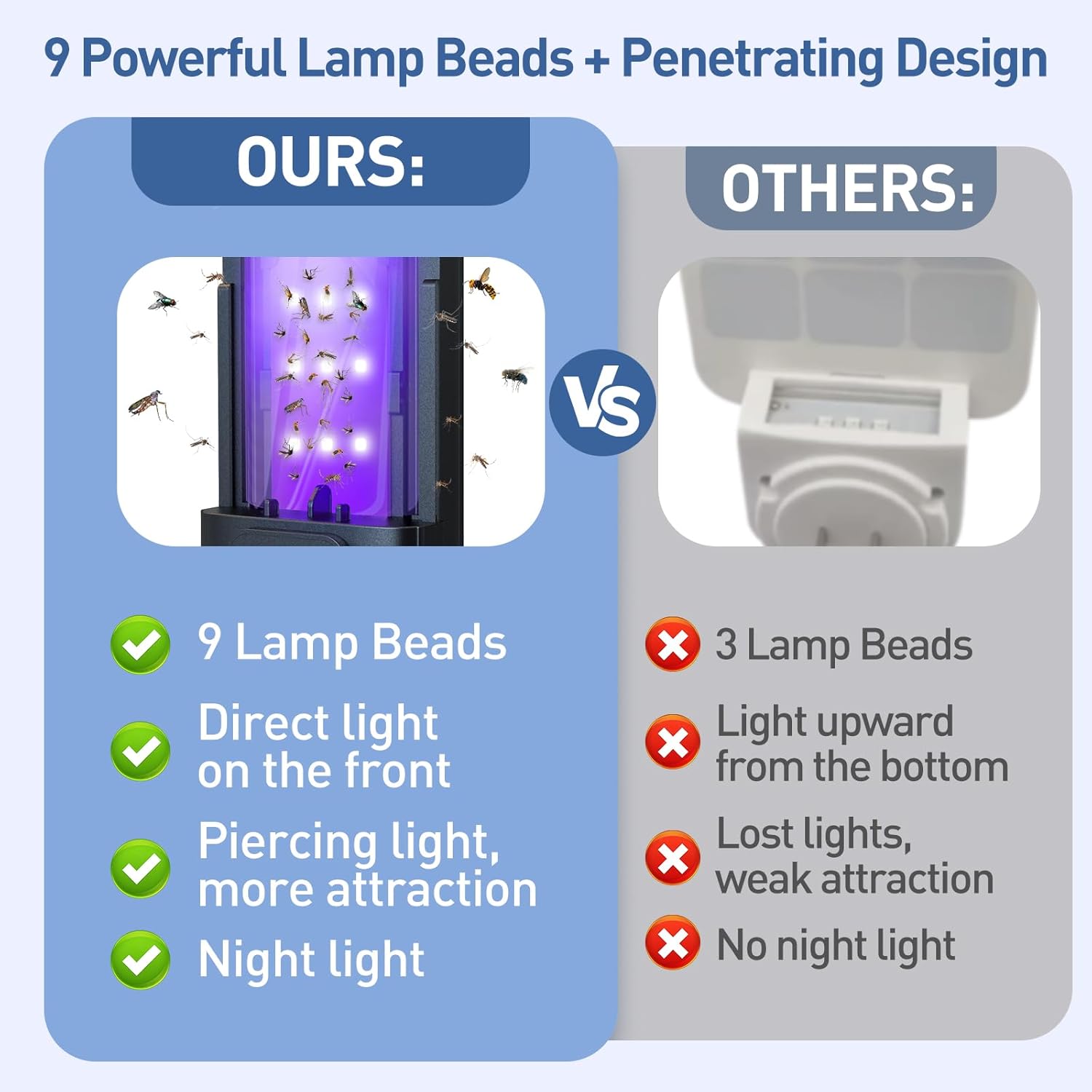 - 【Plug-in Insect Trap for Home】This indoor fly trap features 9 UV light beads that emit UVA light in the 365-395nm wavelength, attracting house flies, gnats, moths, fruit flies, and other flying pests. For best results, activate the UV light and minimize other light sources. Position the trap in a dark, enclosed space for optimal mosquito control.