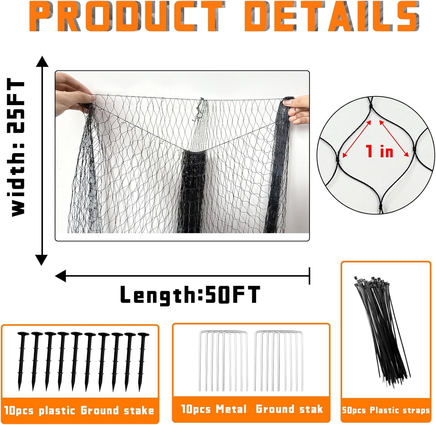 - Bird Netting Kit: Bird netting is available in different sizes, you can combine it with your needs before buying. The 1 inch diamond mesh provides optimal ventilation and light for plants while effectively blocking birds, hawks, and other animals. 10pcs plastic bround stake, 10pcs metal bround stak, 50pcs plastic straps, complete set