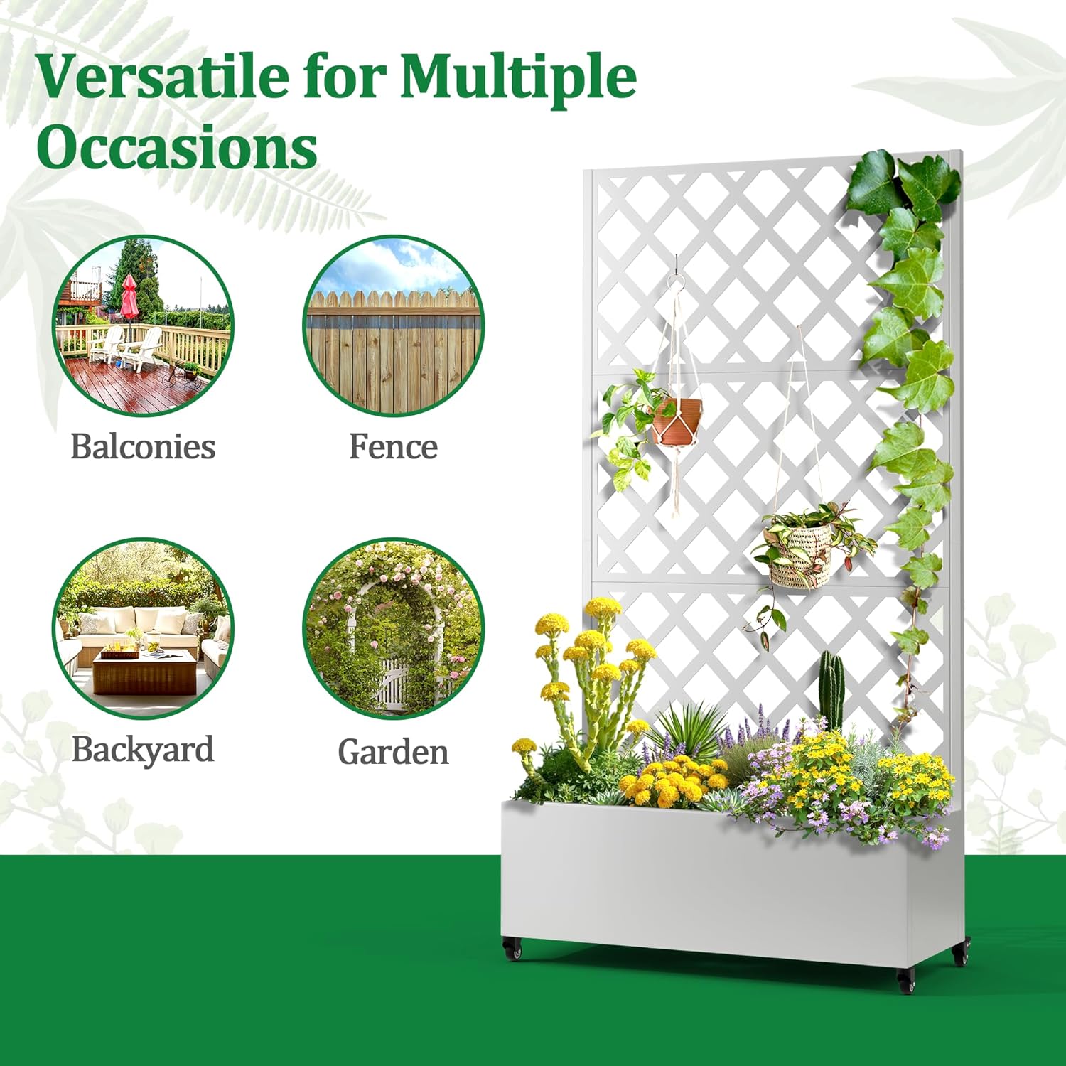 Metal Raised Garden Bed with Trellis and Wheels, 2 in 1 Trellis with Planter Box & Privacy Screen for Climbing Plants, Outdoor Standing Flower Beds with Drainage Holes, 35.4"L x 15.7"W x 70.9"H, White