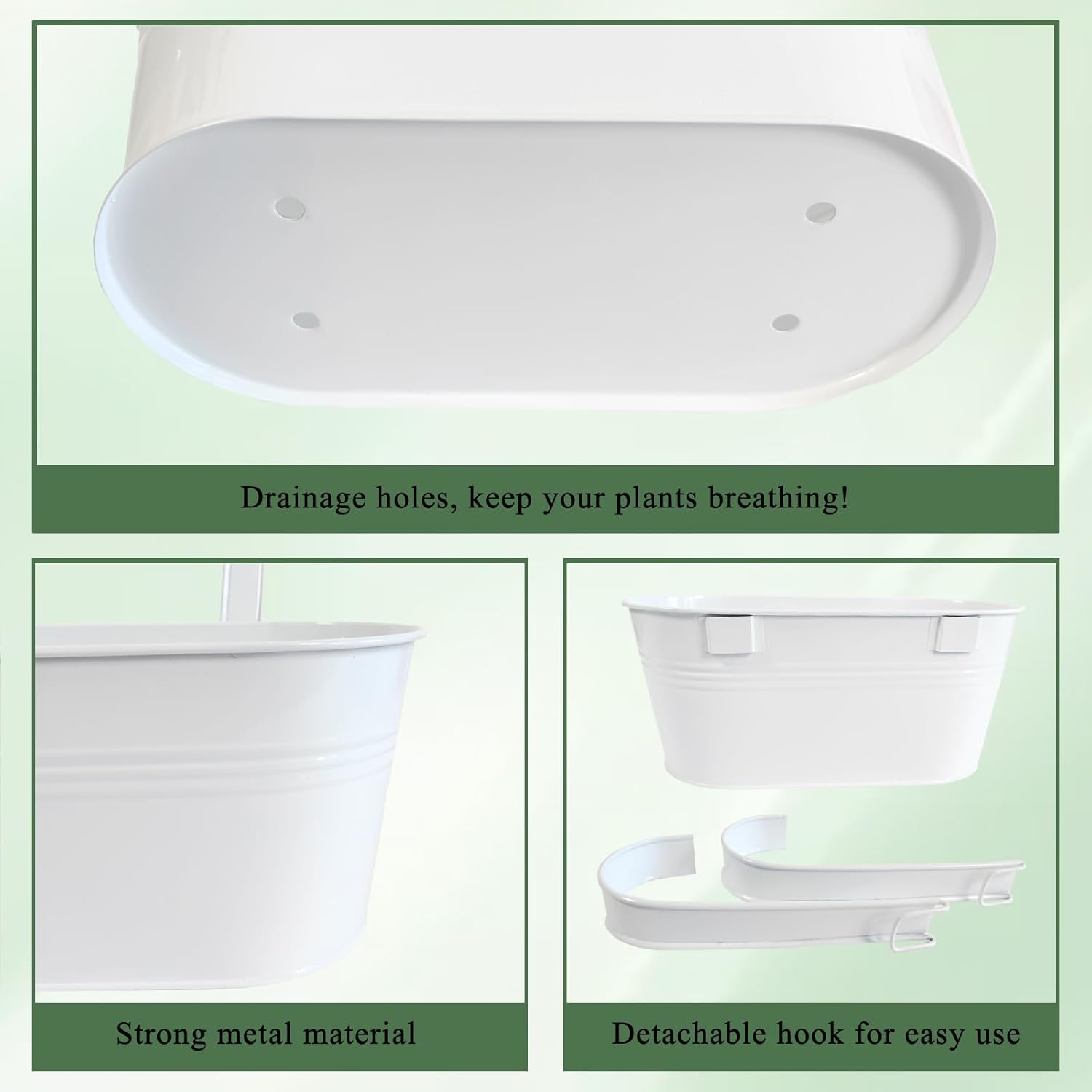 - Detachable Hook & Drainage Hole: The removable hook makes it easy to hang on deck railings, fences, or windows. The drainage hole prevents overwatering, keeping plants healthy. Great for patio planters, herb gardens, or succulents—indoors or outdoors