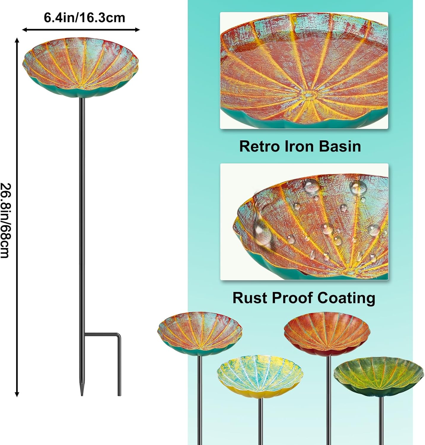 - Durable Design: The bird bath for outside is made of high quality material, waterproof, not easy to fade. The pole of the hummingbird birdbath is not easy to break, and the two sturdy tips allow the birdbath to stand firmly in the garden soil, can be used for a long time