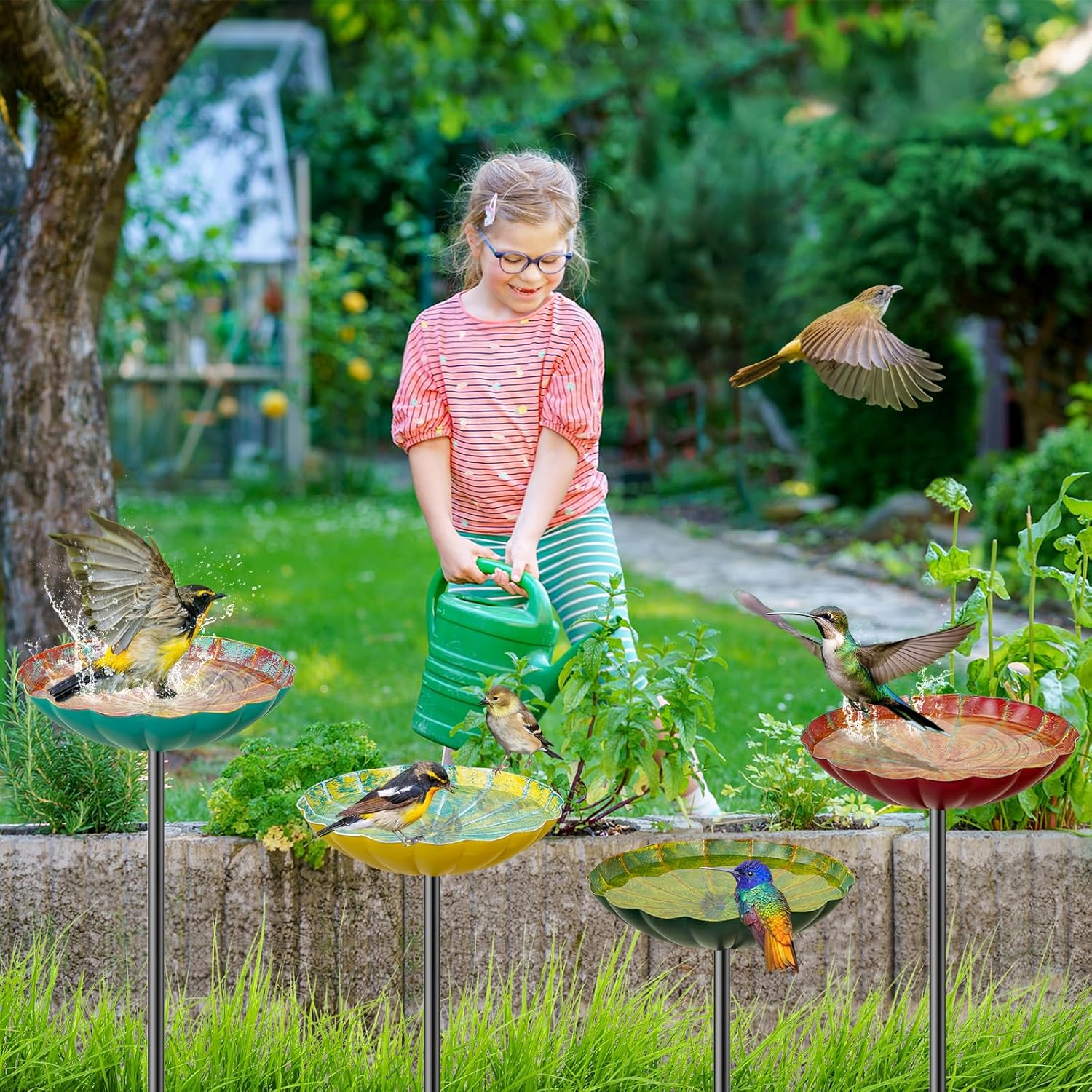 - Versatile Use:Not only can these free standing bird feeder & bird baths serve as a refreshing oasis for your feathered friends, but they can also double as a bird water feeder, making it easy to provide nourishment for various species, including hummingbirds.Adding stones or marbles in it as a bee watering station is also a good option