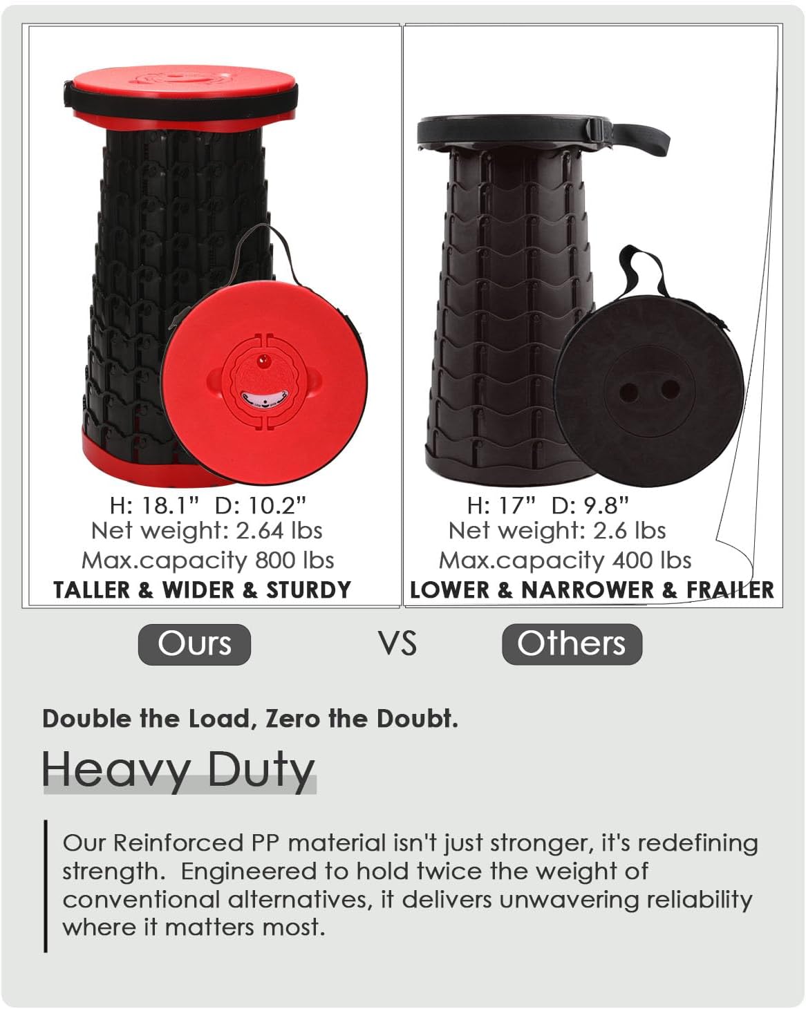 - 800 LBS HEAVY-DUTY CAMPING STOOL – Reinforced PP material, delivers double the industry strength, creating ultra-safe portable stools for adults of most sizes.