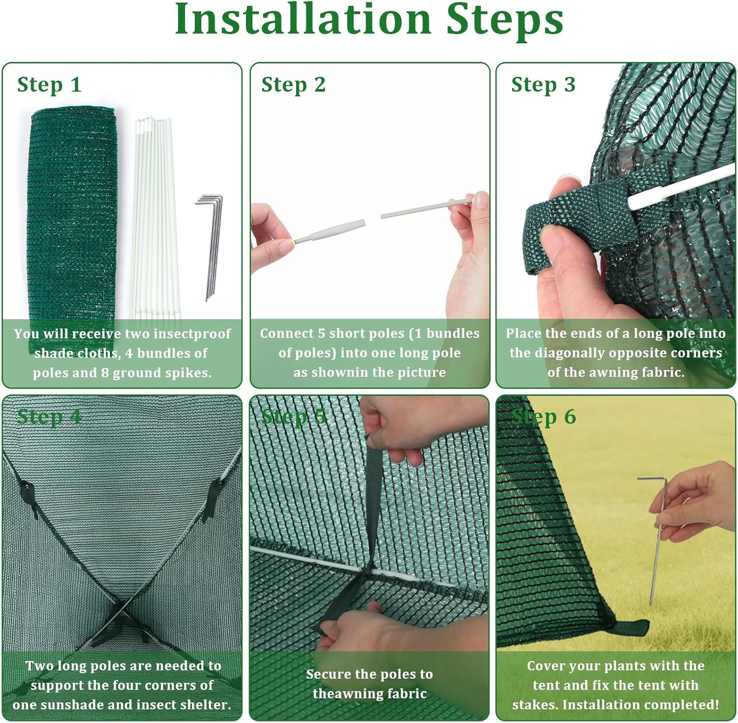 - Easy Use: The green plant shade tent is easy to assemble, please refer to the video on the details page for the operation steps. Please note: insert one pole into the corner pocket first before connecting the other poles, so that the poles will not fall apart easily during installation.