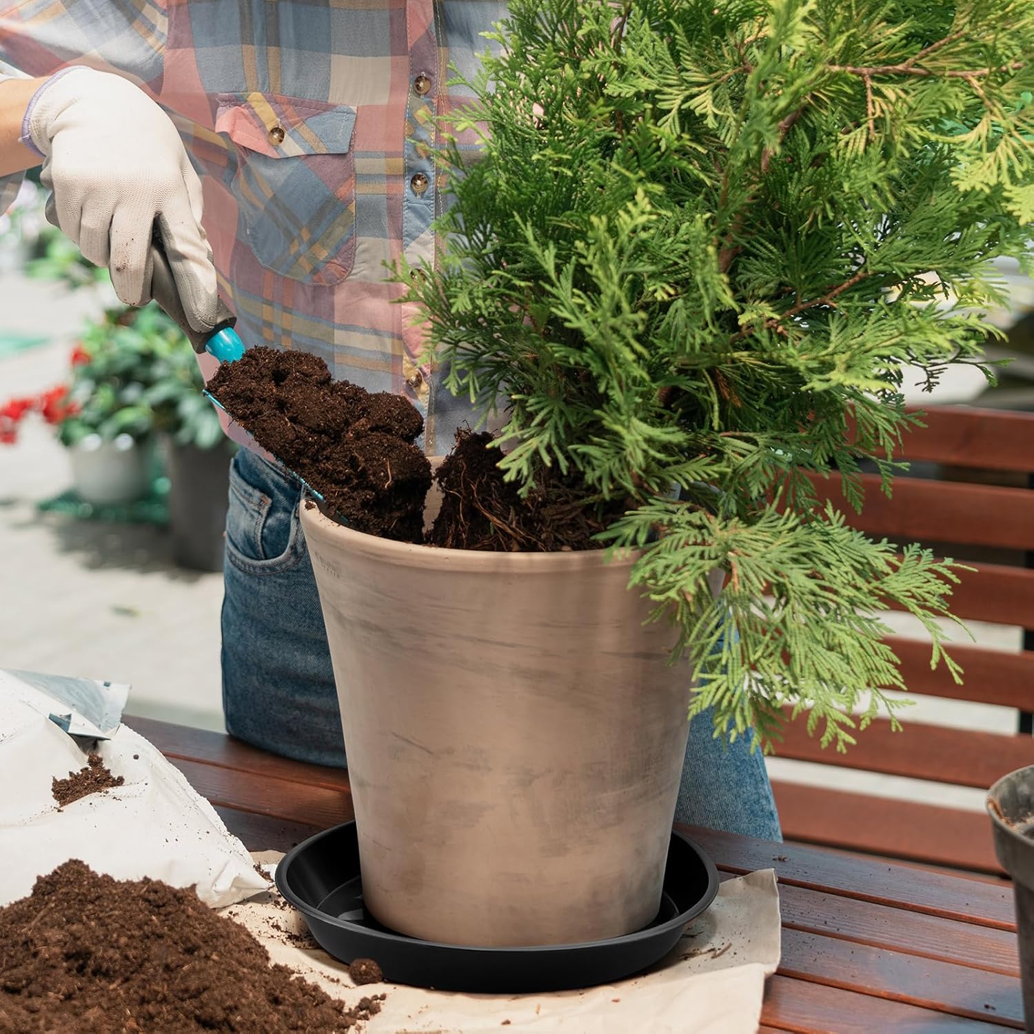 - Leakproof Design: the round plant tray is designed with an appropriate height, which can collect excess water and soil, provide protection between the saucer and the floor or furniture, so you don't have to worry about water spilling or wearing furniture