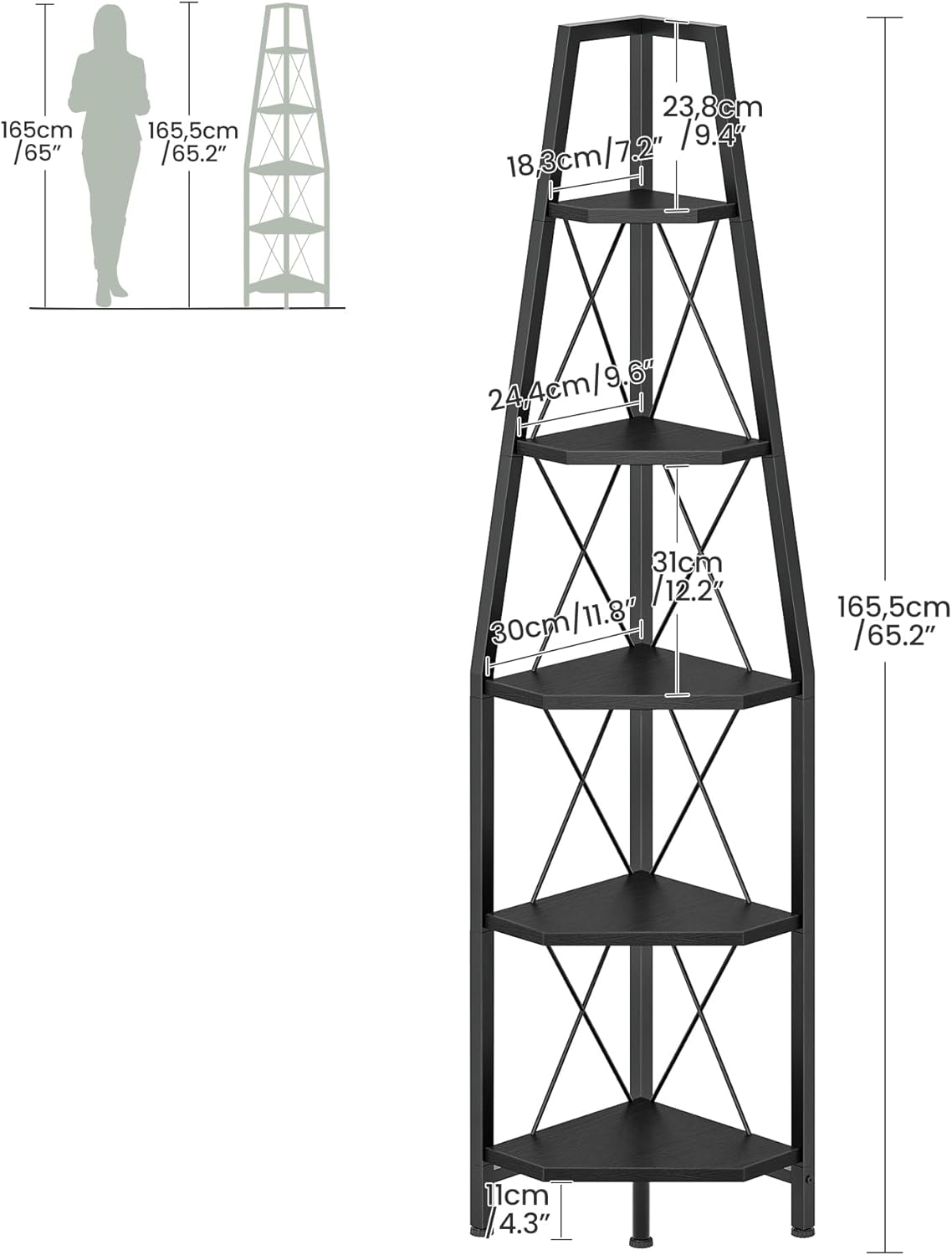 - Maximize Corner Space: Our 5-tier corner shelf measures 11.8''L x 11.8''W x 65.2''H and features a 90° right-angle back design, fitting snugly against walls to maximize unused corners. Its multi-level structure offers ample storage and keeps your space organized