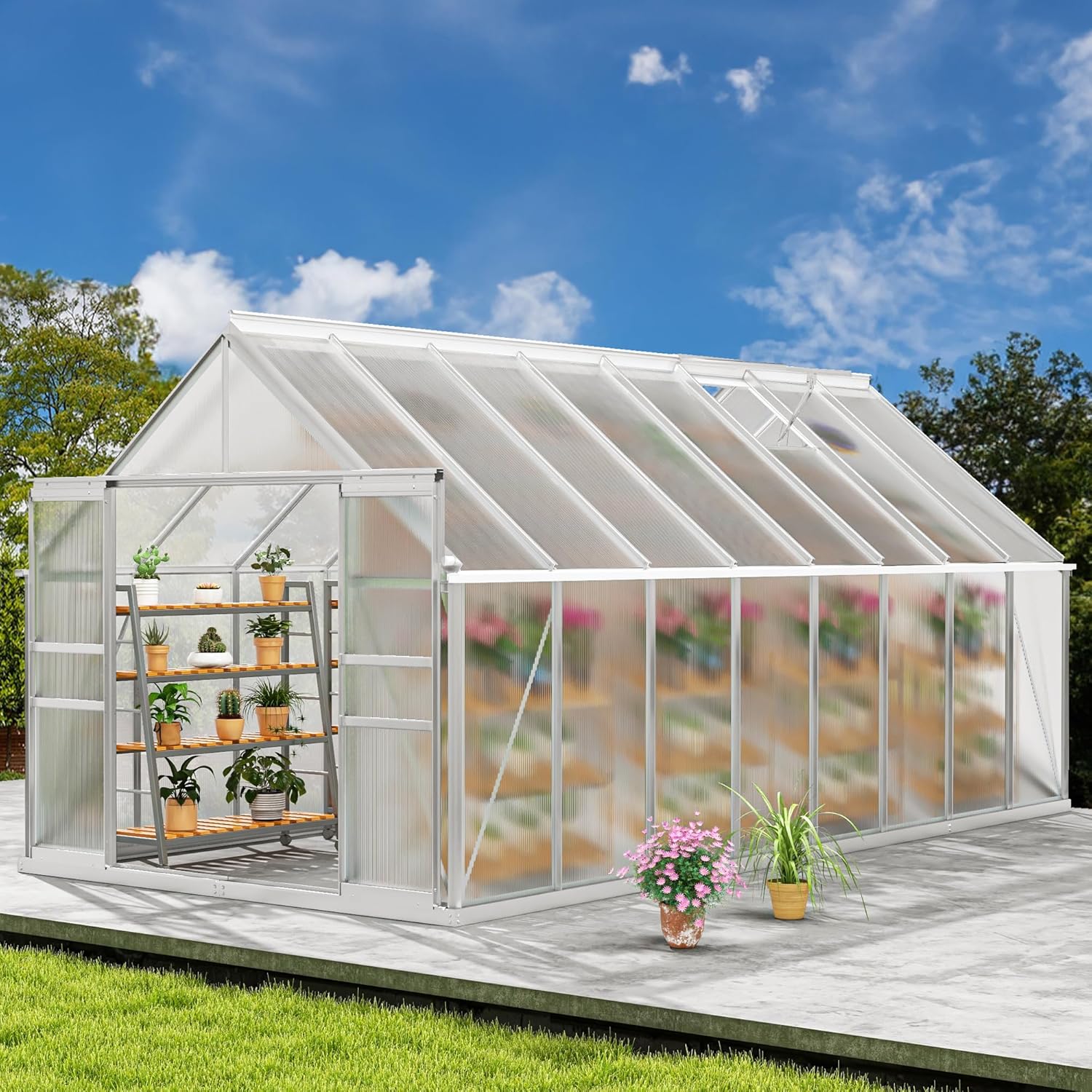 DWVO 16x8FT Polycarbonate Greenhouse Heavy Duty Green Houses Outdoor Aluminum Greenhouses with Sliding Doors Vent Window Premium Walk-in Greenhouse Large Sun House for Garden Backyard, Silver