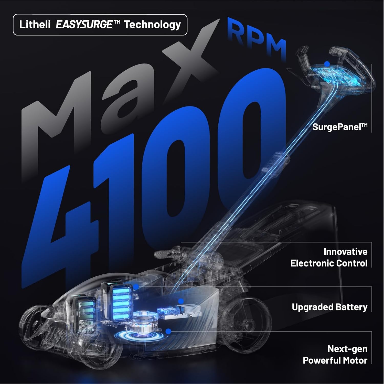 - EASYSURGE TECHNOLOGY: Powered by advanced Easysurge technology with a maximum speed of 4100 RPM than typical gas, it handles all grass types effortlessly. The SurgePanel ensures smooth operation for a truly efficient and hassle-free mowing experience.
