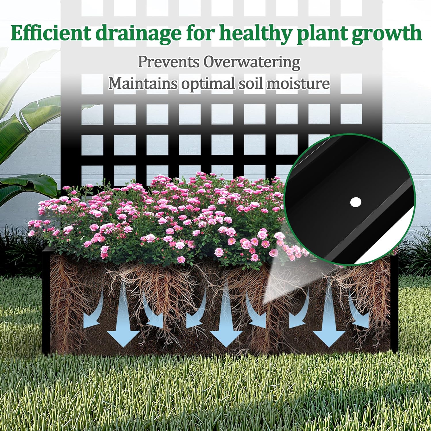 - Optimal Water Management: The planter with trellis features a deep planting bed, offering generous space for healthy root development. The raised garden bed also comes with built-in drainage holes that efficiently prevent water accumulation, helping your plants maintain proper moisture levels for optimal growth.