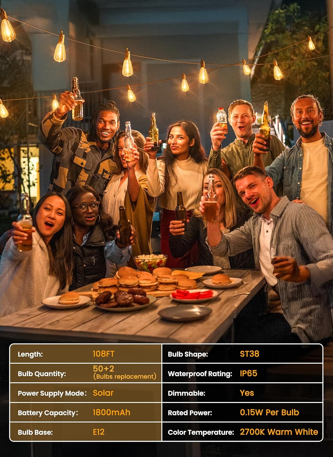 Brightown Solar Lights Outdoor Waterproof 108FT with 50 Shatterproof ST38 LED Bulbs, 2700K Solar Lights Outdoor with Remote, Solar String Lights for Outside, Camping, Yard, Party Decor