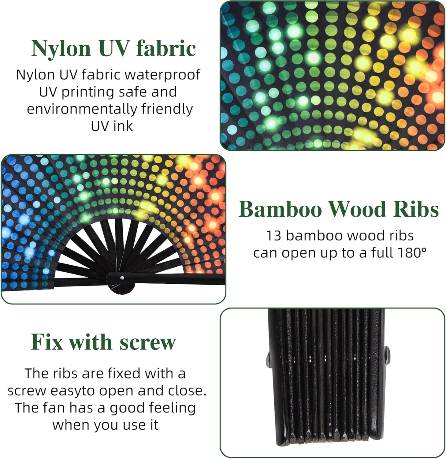 - Material:Selected nylon fan surface combined with natural bamboo bone, reinforced skel eton with metal rivets, with delicate and durable craftsmanship