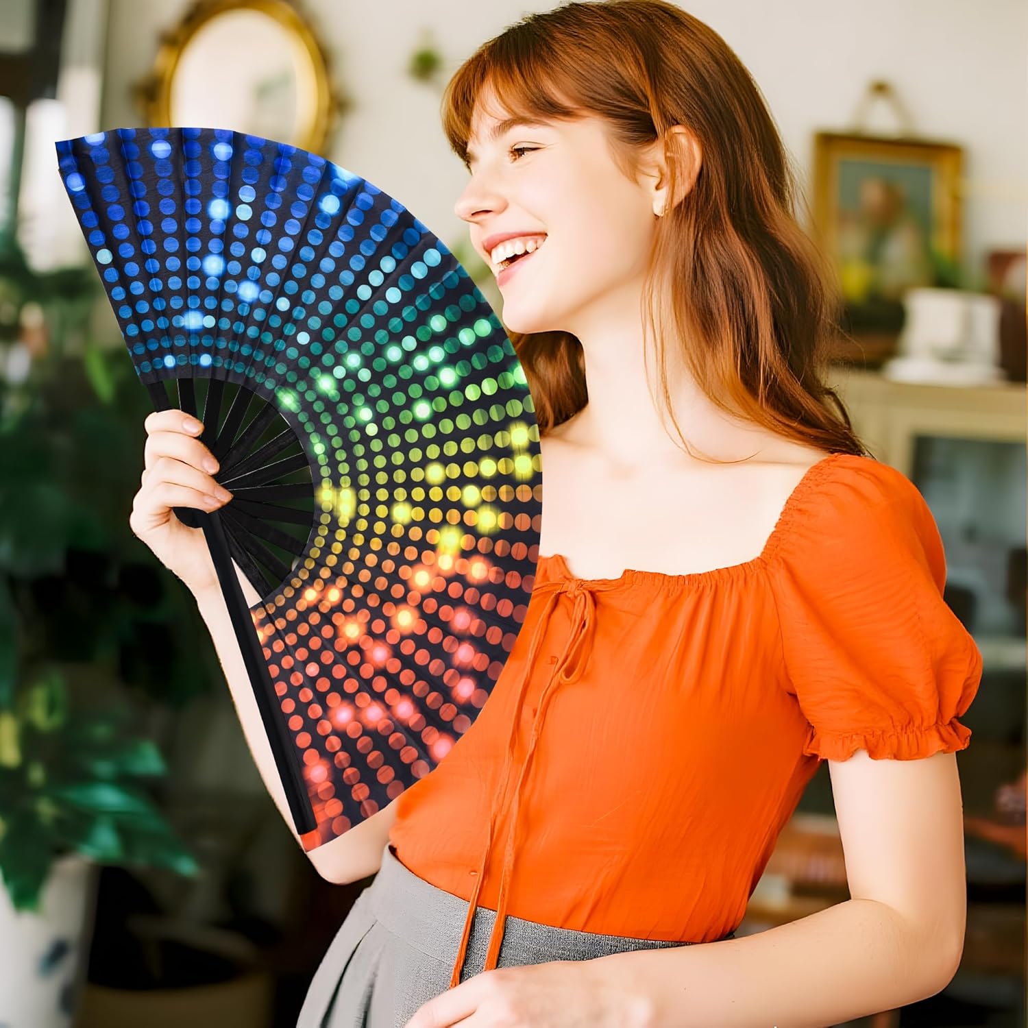 - BRIGHT COLORS:The bamboo fan features a glittery fluorescent ink design that sparkles in lightor sunlight, with bright and vivid colors enhancing your performance with vibrant charm