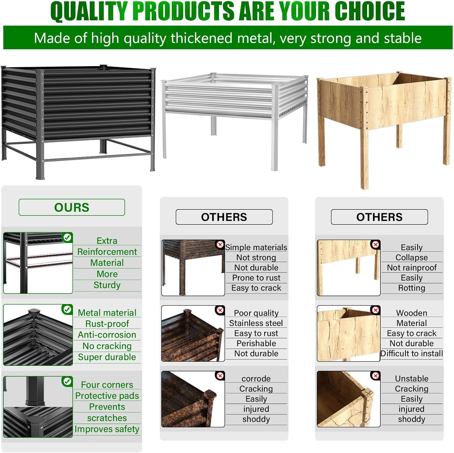 - 【Distinctive Design】-Outdoor elevated garden beds, our custom design style features galvanized sheet metal on the top, a stainless steel frame on the middle base, and the lower four corners are made of heavy-duty steel with a black powder-coated finish,This combination exceeds the lifespan of wooden products and ensures excellent rust resistance to keep the garden bed in the best condition for a long time.