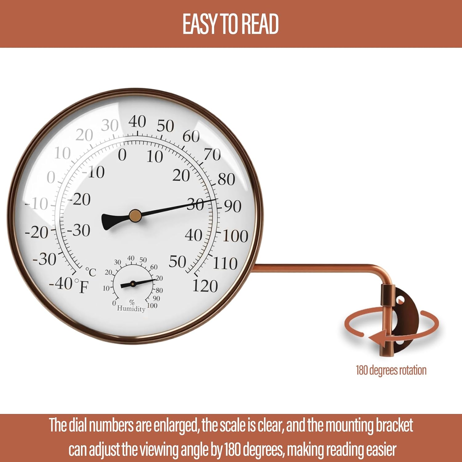 - EASY TO READ: 6 INCH outside thermometer dial numbers are enlarged, the scale is clear, and the mounting bracket can adjust the viewing angle by 180 degrees, making reading more intuitive