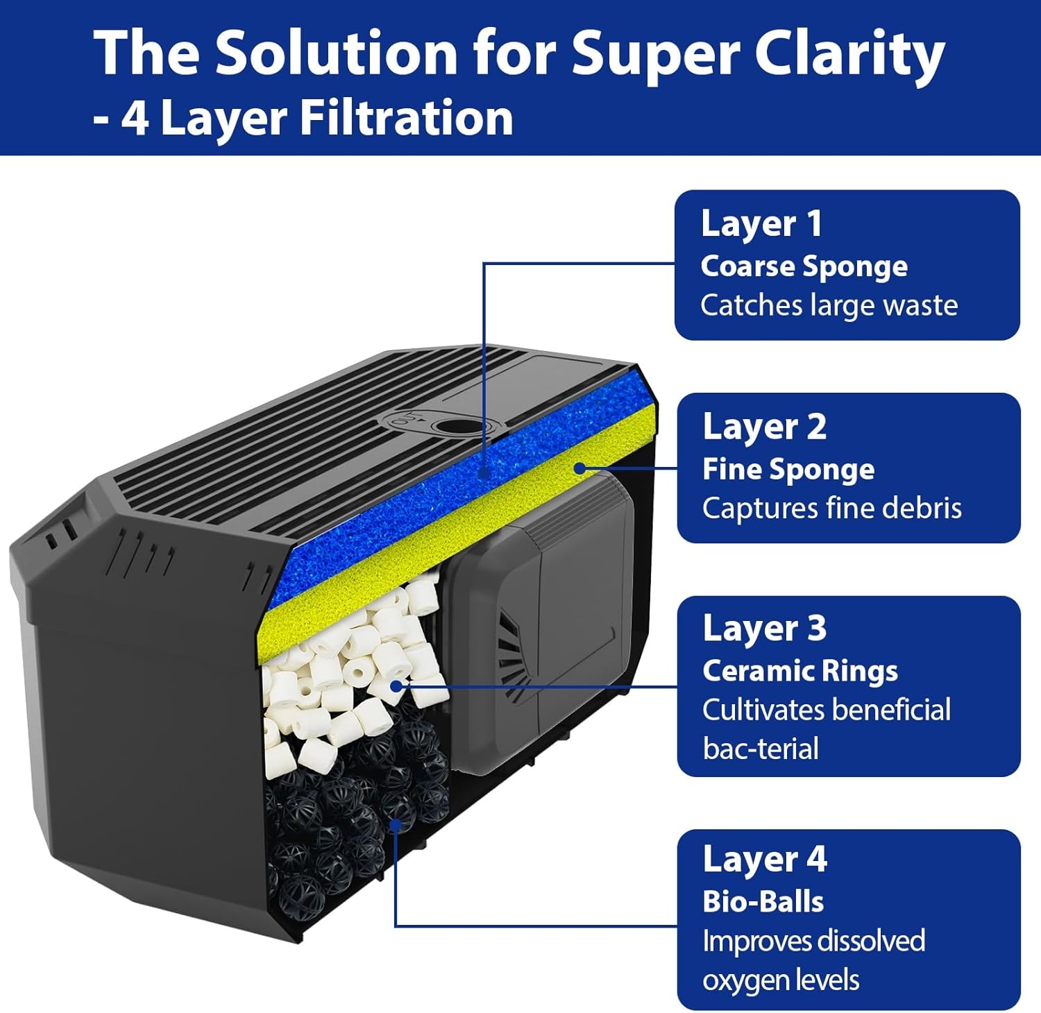 - 4-LAYER FILTRATION – Achieve crystal-clear water with this advanced pond filter box. Its 4-layer filtration process includes: Layer 1 – Coarse Sponge (traps large debris), Layer 2 – Fine Sponge (captures fine particles), Layer 3 – Ceramic Rings (Cultivates bene-ficial bac-te-ria), and Layer 4 – Bio-balls (Improves oxygen levels). Perfect for maintaining a clean and healthy pond environment.