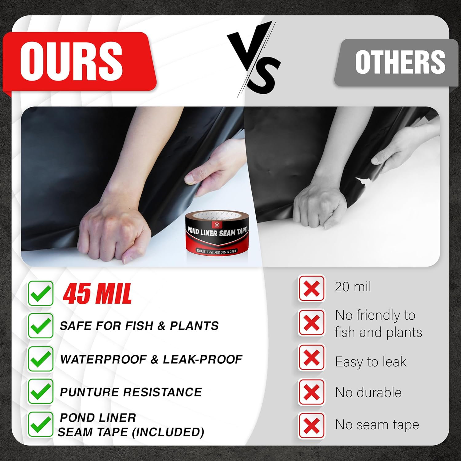 - [Premium Pond Liner Seam Tape Included] When a pond liner accidentally comes into contact with sharp objects, it can leave holes having an impact on the continued use of the liner. So, our self-adhesive design (included) is convenient, you only need to clean up the pond skin to be sealed areas keep the surface dry, then tear the product and apply it to the seam area. It will help to maintain and extend the use of the pond liner.