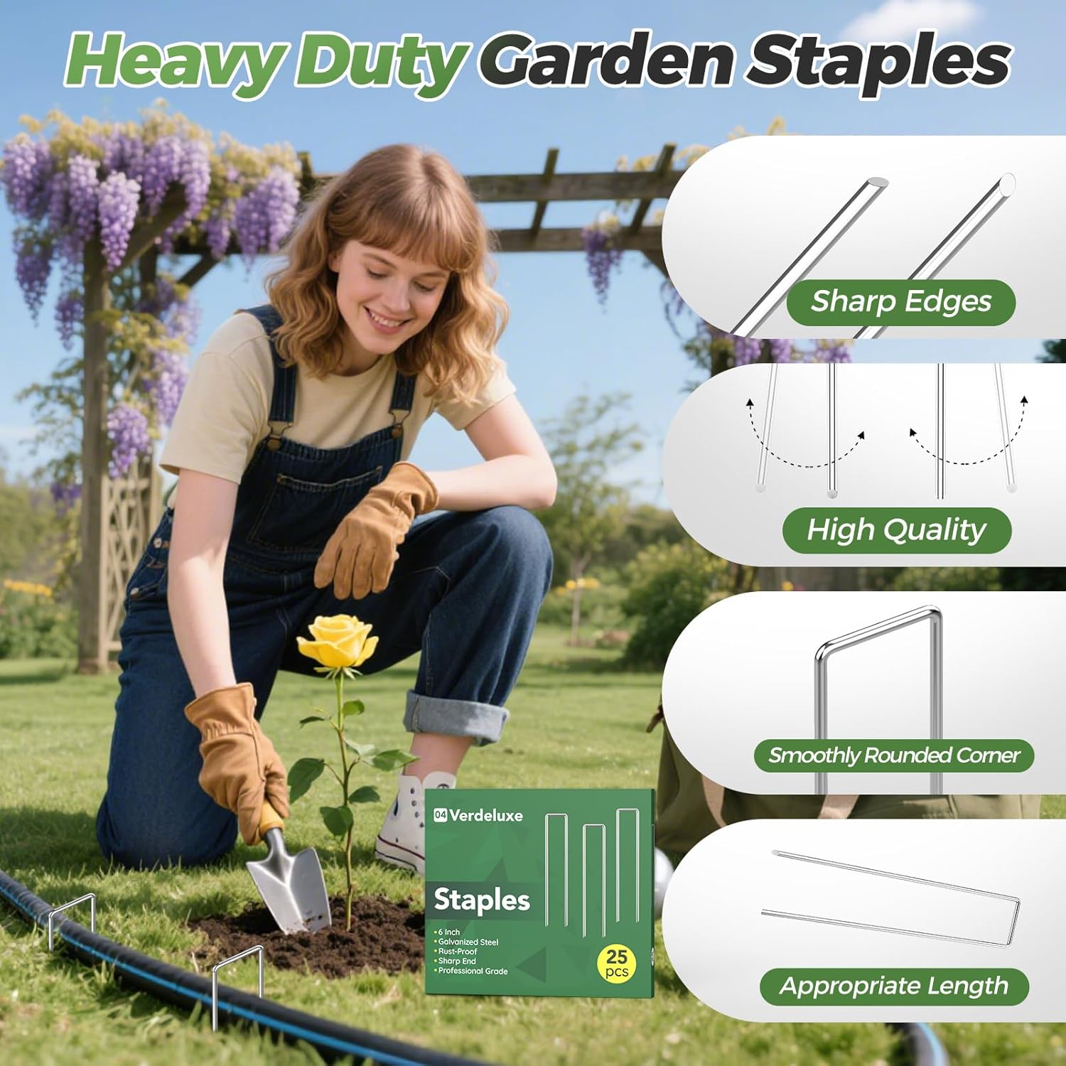 - 【PACKAGE INCLUDED and SIZE】Verdeluxe landscape staples come in a 25 pack,made from high-quality galvanized steel, they laugh off rain, mud, and sun.The 11 gauge ground stake,At 6 inches long and 1.2 inches at top wide, the width below is 1.5 inch,they drive deep into soil, gravel, or grass and stay put,whether you’re securing garden plastic or holiday balloons.This isn’t flimsy hardware; it’s the kind that sticks around season after season, saving you from redoing the job.