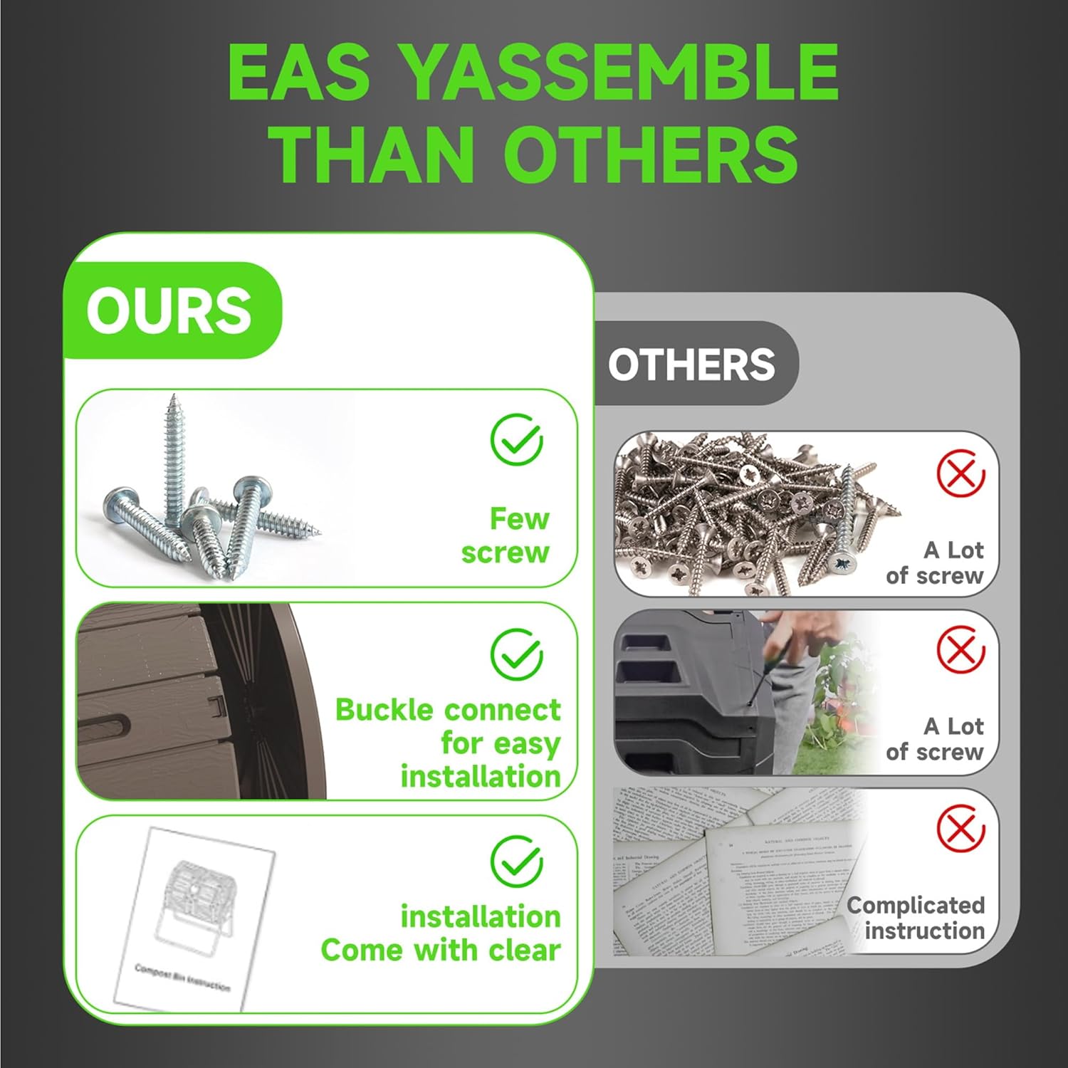 - 【EASY TO USE】: Our outdoor composter has a large opening with a removable sliding door that makes it easy to add waste or remove compost. The compost bin is designed with a secure seal to keep rodents, insects and other pests out, ensuring a safe and efficient composting process.