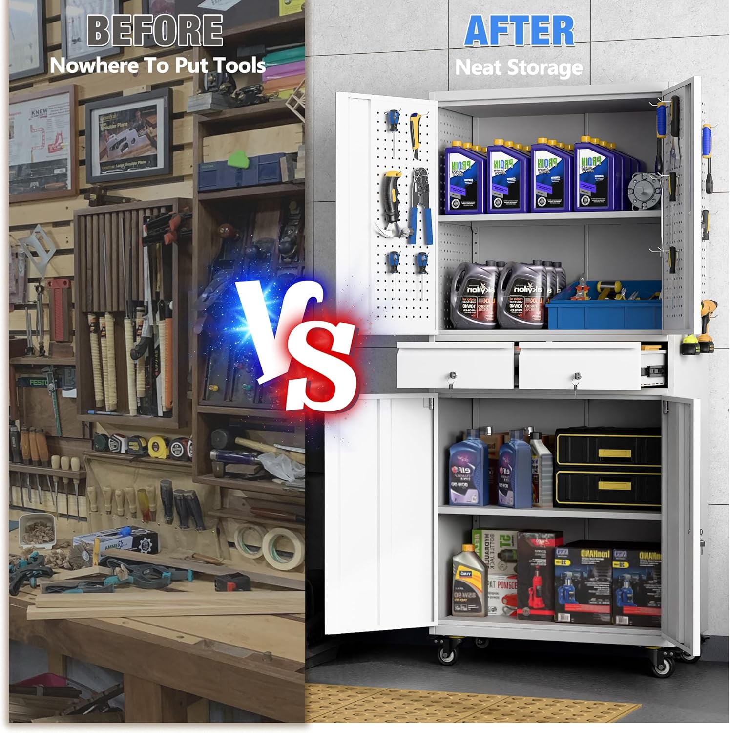 Garage Storage Cabinet with Wheels, Metal Storage Cabinet with 2 Drawers and 2 Adjustable Shelves, Metal Lockers with Pegboards for Homes, Offices, Kitchens, and Pantries, Gray and White