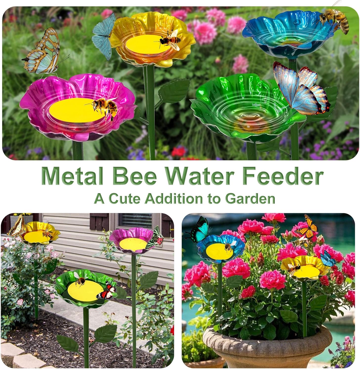 - Nature-Inspired Design in 4 Colors: Our bee watering station for garden features lifelike flower shapes and leafy stems in four vibrant colors—an eye-catching butterfly feeder and bee bath that doubles as charming metal garden decor