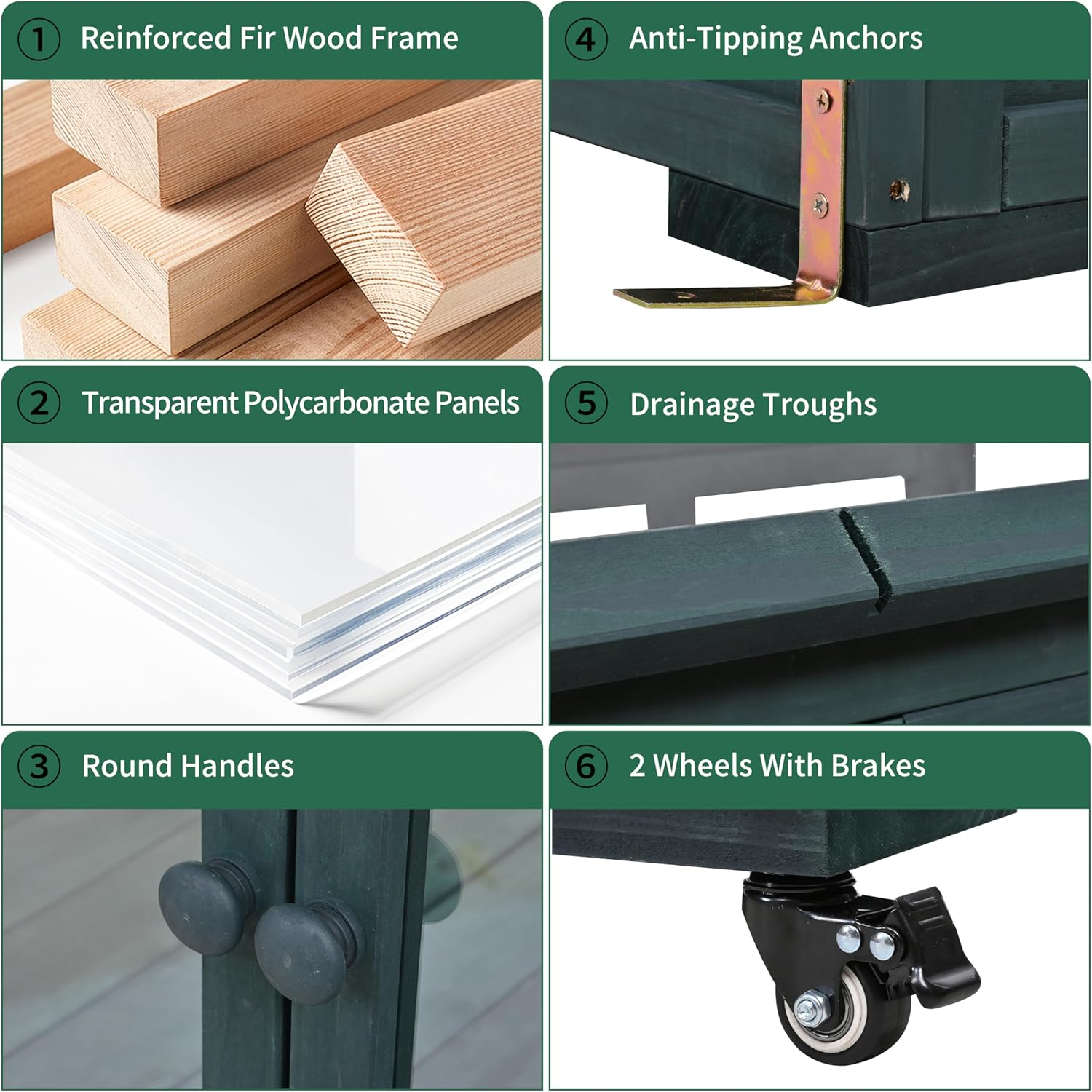 - Durable Fir Wood Greenhouse: Built with sturdy fir wood & transparent polycarbonate panels, this greenhouse offers superior durability & even sunlight diffusion. Protect your plants from harsh light & create the perfect growing environment for seedlings, herbs & winter crops!