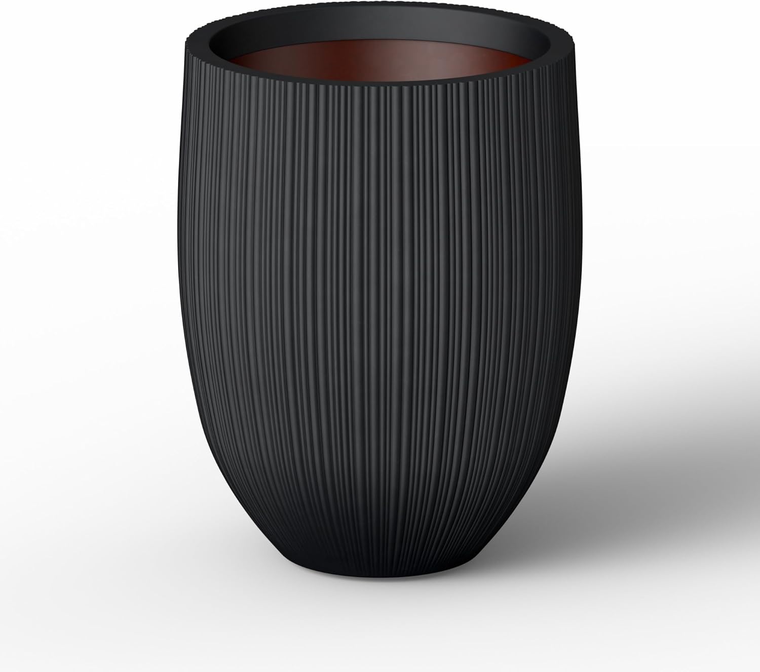 Kante Round Fluted Concrete Planter, 16.9-Inch Dia Barrel-Style Pot with Drainage Hole, Black Finish with Warm Brown Interior, 13.7" Opening, for Indoor and Outdoor Use