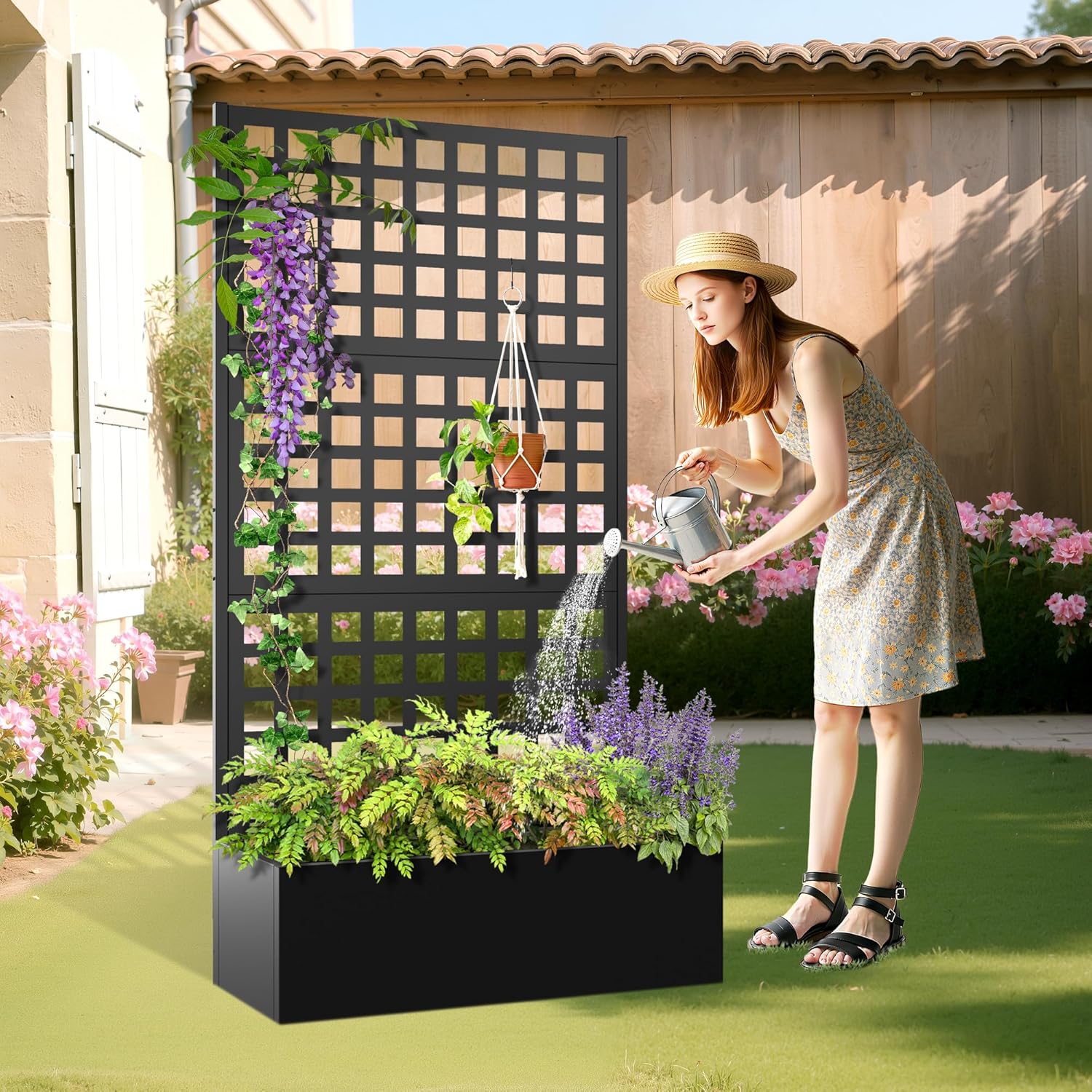 - 🛡️【Outdoor Privacy Screen & Metal Planter Box with Trellis】Use this metal planter box with trellis to create a natural divider on your patio, balcony, or yard. It’s more than just a garden raised bed for climbing plants—it’s also a beautiful metal planter with privacy screen that offers shade and separation. The sleek black frame and vertical lines of this metal planter box with trellis make it both decorative and practical.