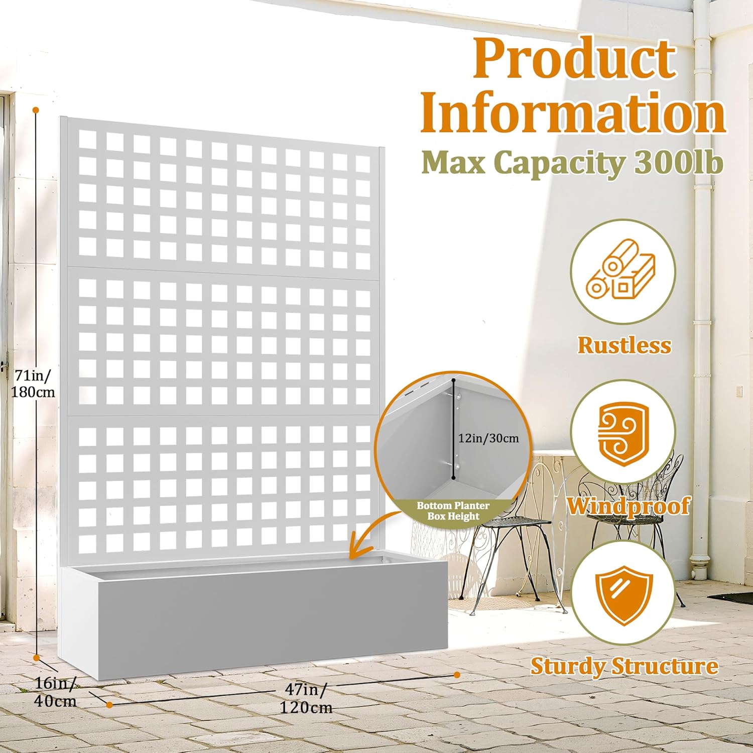 - 🌿【Durable Metal Planter Box for All-Season Gardening】This metal planter box is crafted from rust-resistant galvanized steel, ensuring durability and strength in all weather. Whether you’re growing tomatoes or roses, this garden raised bed for climbing plants offers reliable support. The integrated structure transforms your outdoor space into a stylish metal planter with privacy screen, and the sturdy frame makes this metal planter box with trellis a lasting garden feature.