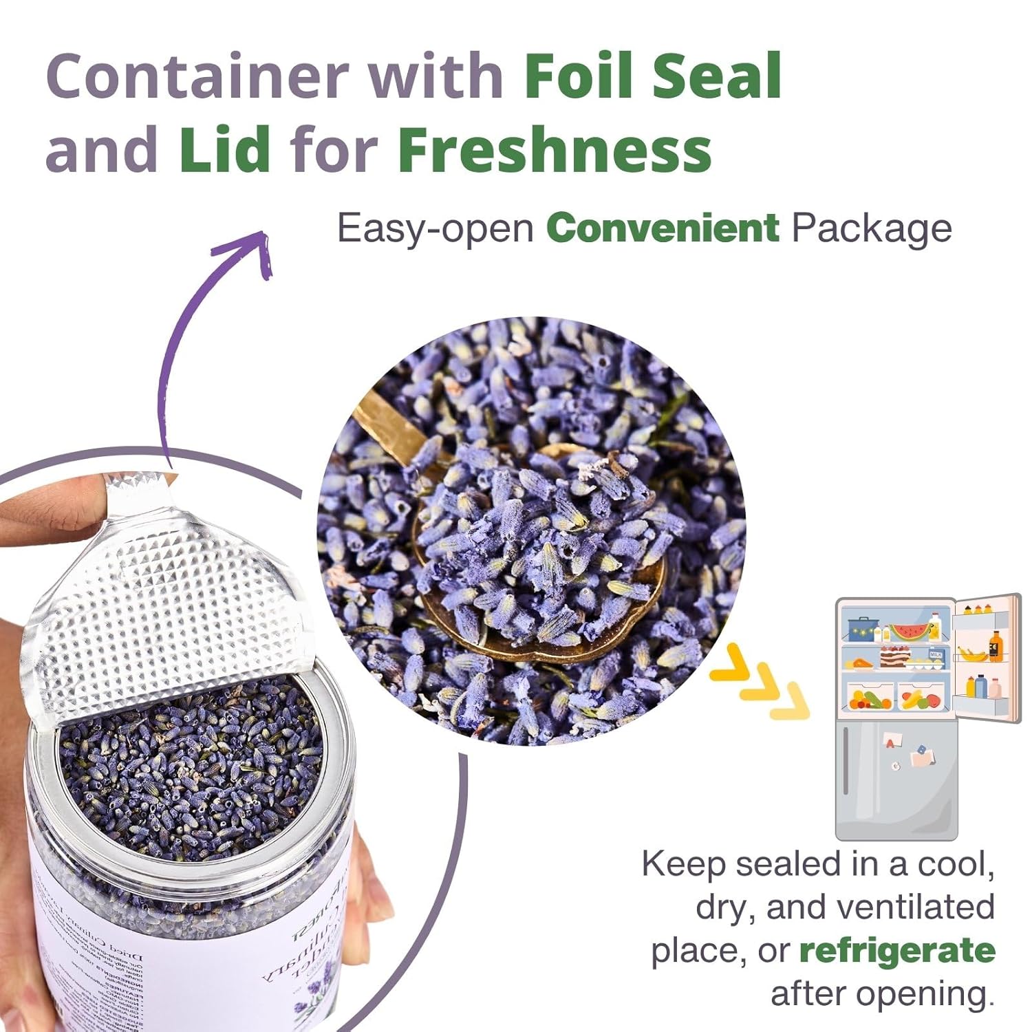 - 【100% Natural Food Grade Lavender Flowers】Premium dried lavender buds carefully handpicked and naturally air-dried to preserve their vibrant color, floral aroma, and essential oils. Freshness in Every Bud. Free from additives, preservatives, GMOs, gluten, and chemicals