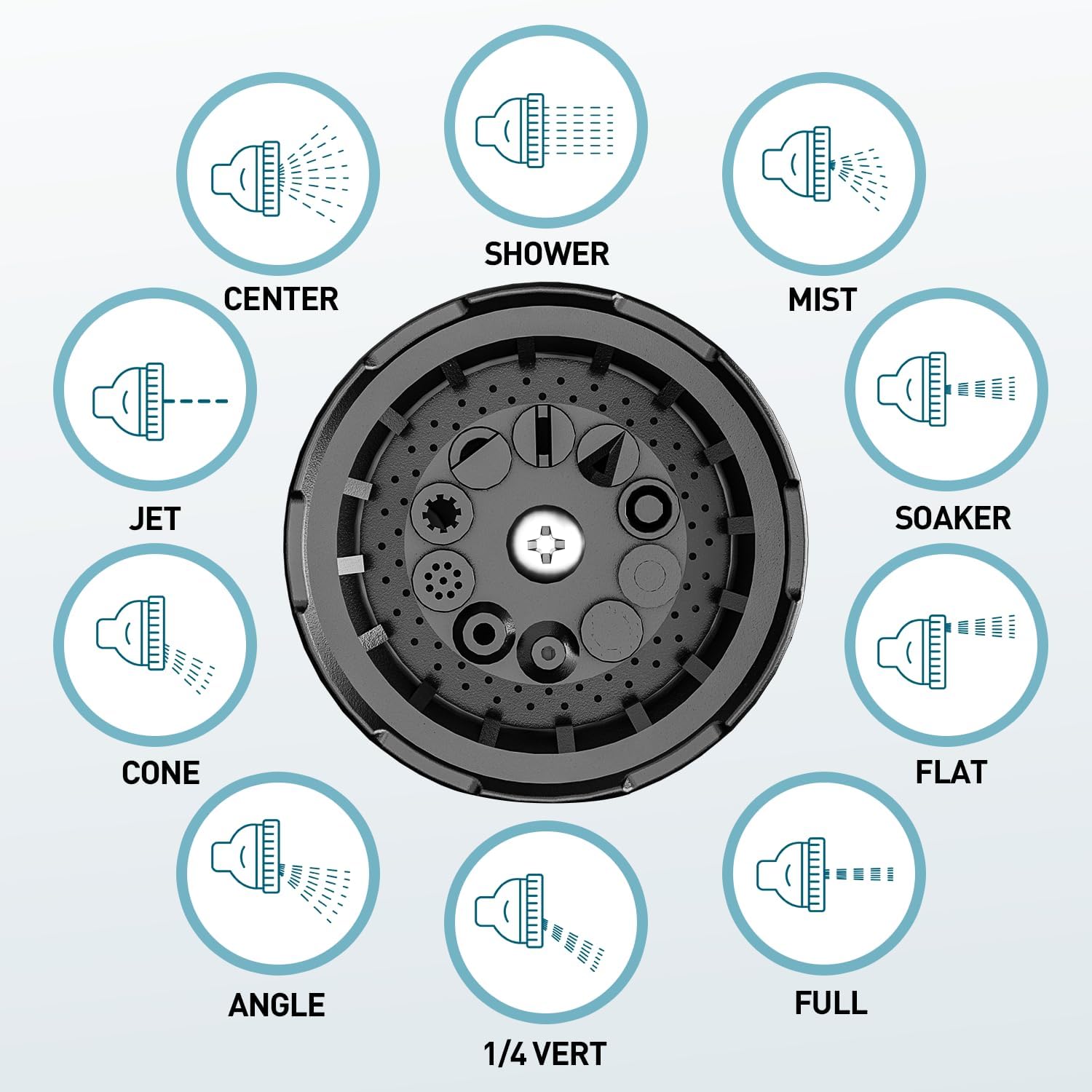 - 10-VERSATILE SPRAY PATTERNS: Precisely engineered to offer ten distinct spray functions: Full/Center/Jet Mist/Shower Soaker/Cone Angle/Flat ΒΌ Vertical Easily switch between patterns to handle everything from delicate seedlings to heavy-duty cleaning.