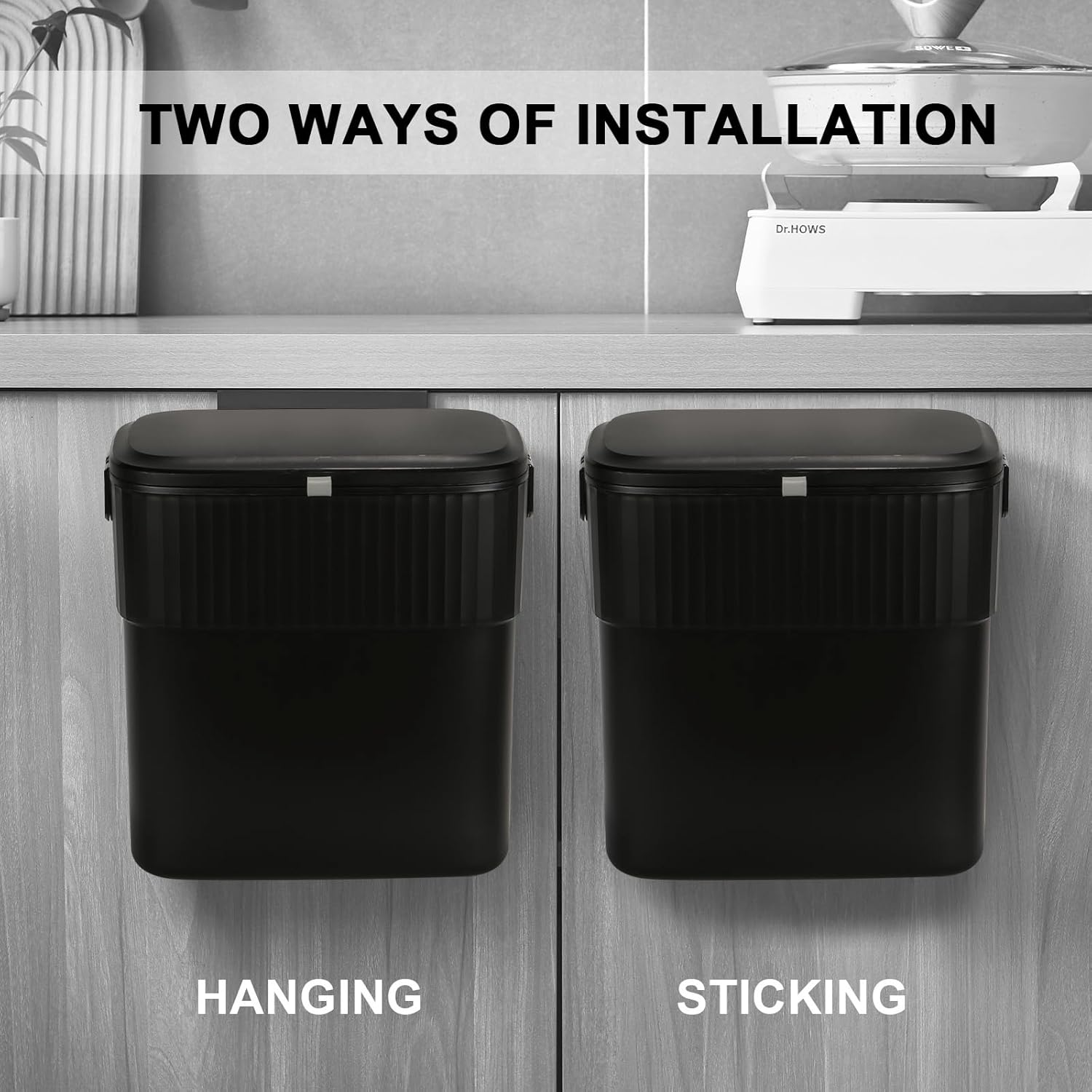 - 2.5 Gallon Wide Application - The 2.5 gallon trash can has a large capacity and fits perfectly in most cabinet doors, pantry doors, and cupboard, not only saving you a lot of space, but also allowing you to throw trash easily without bending down, whether in bathrooms, kitchens, bedrooms, campers, RVs, and other small spaces to add convenience and beauty to your life. (10.5''LĂ6''WĂ11''H)