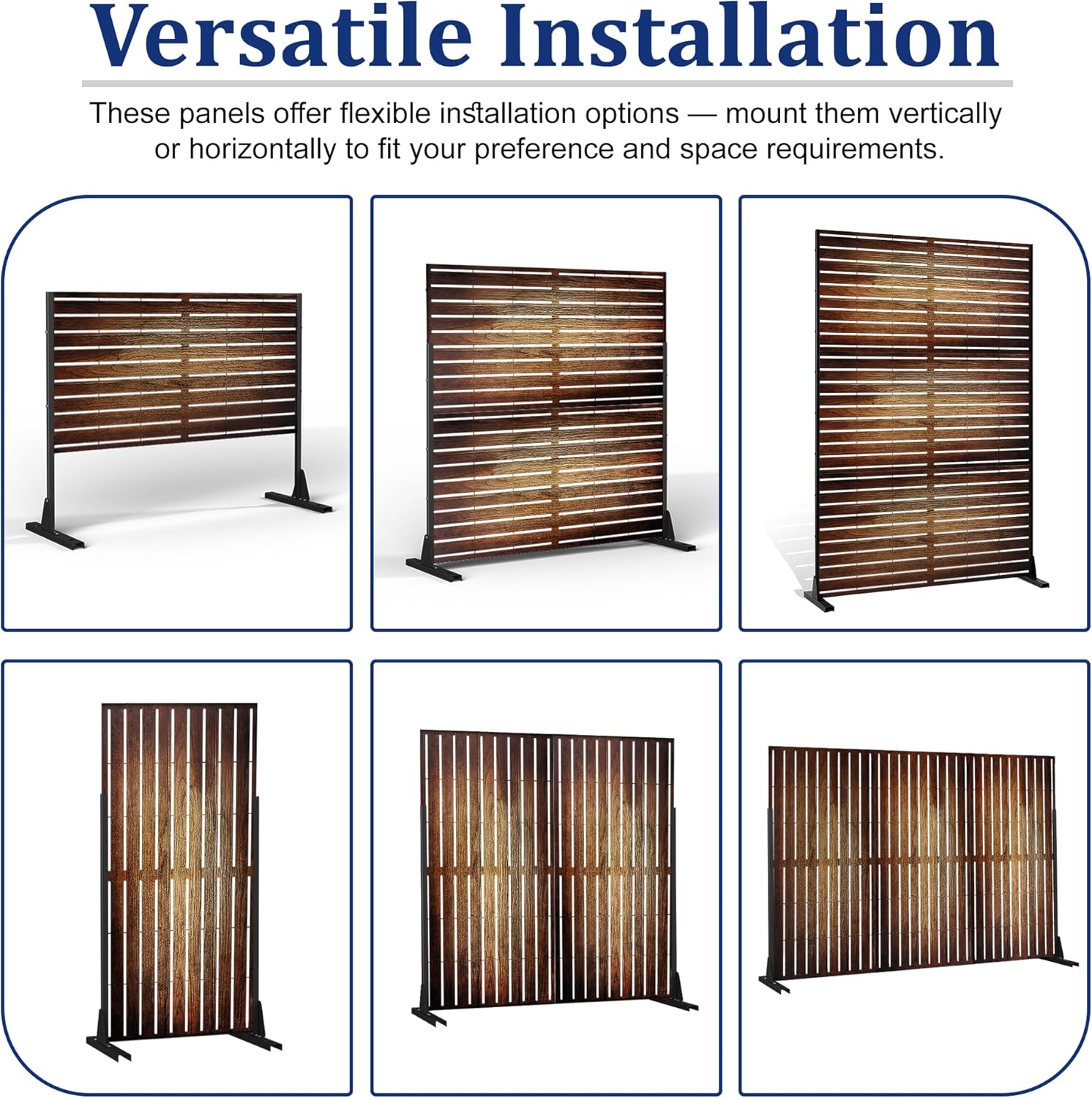 - 【Versatile Installation】Our outdoor metal privacy screens can be installed vertically at adjustable heights (72" or 76") or horizontally, making them ideal for courtyard hanging or wall mounting to enhance your outdoor decor.