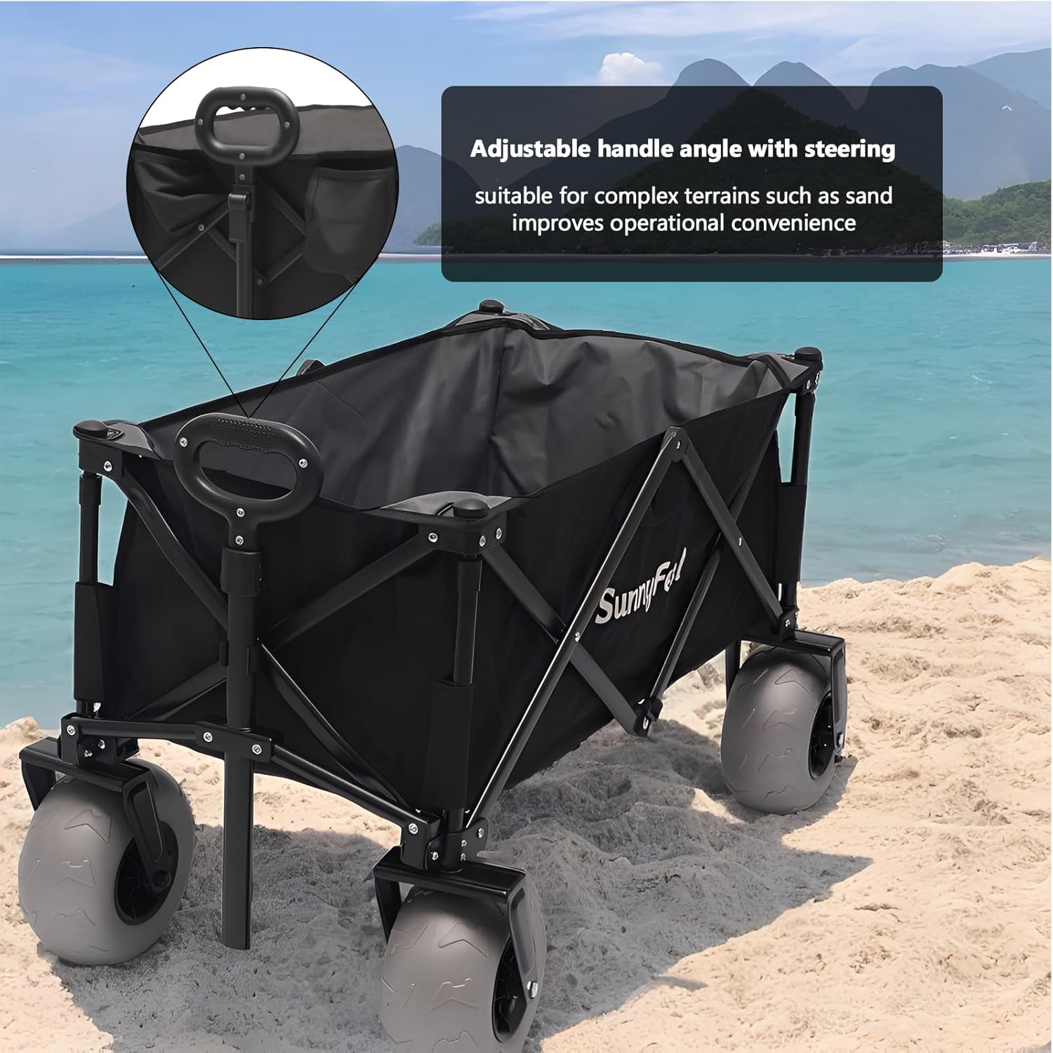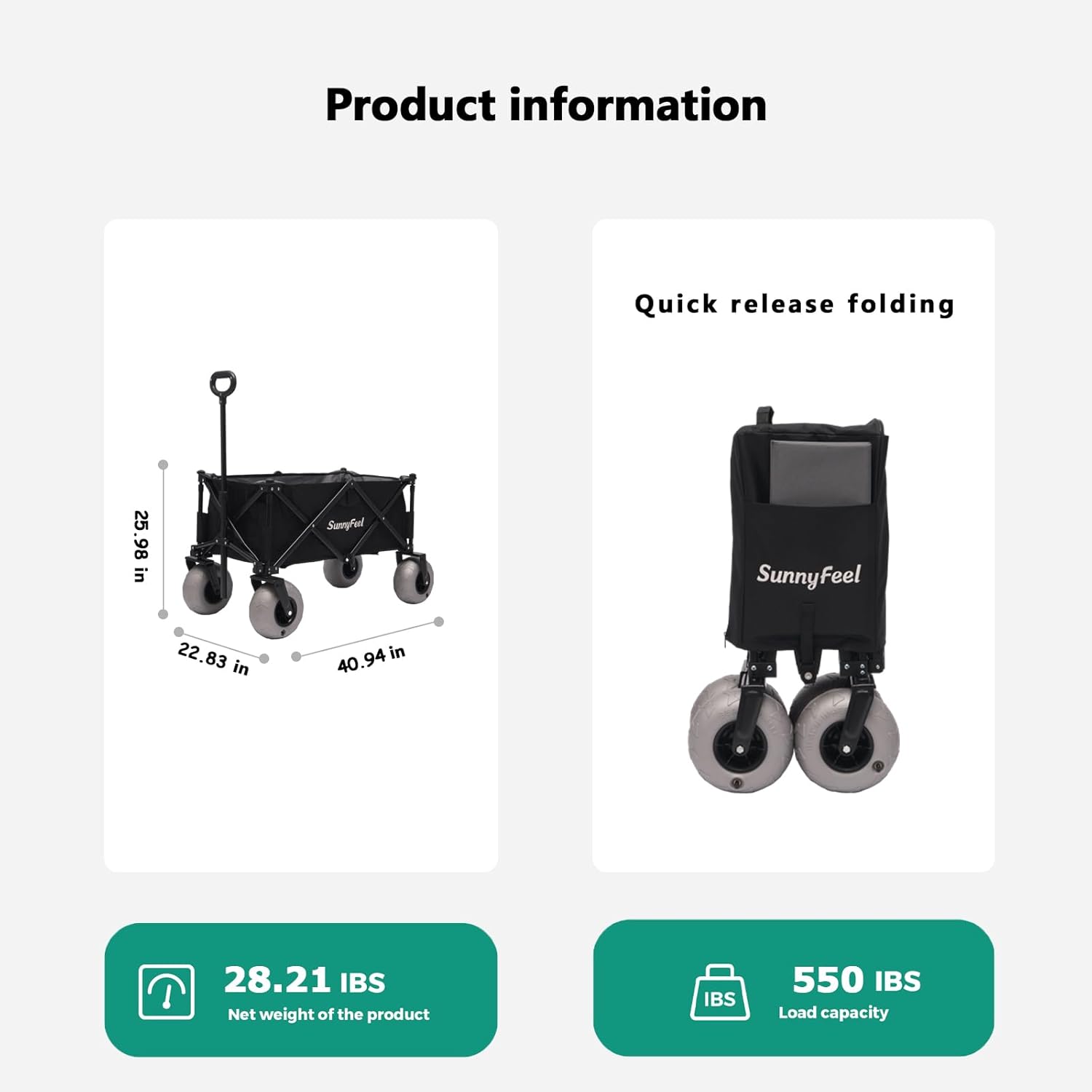 SUNNYFEEL 41''L 550lbs Heavy Duty Beach Wagon with 9" Balloon Tires, 200L Fold Up Wagon Cart Foldable with Side Pocket and Brakes for Camping Sports Garden Shopping (Black)