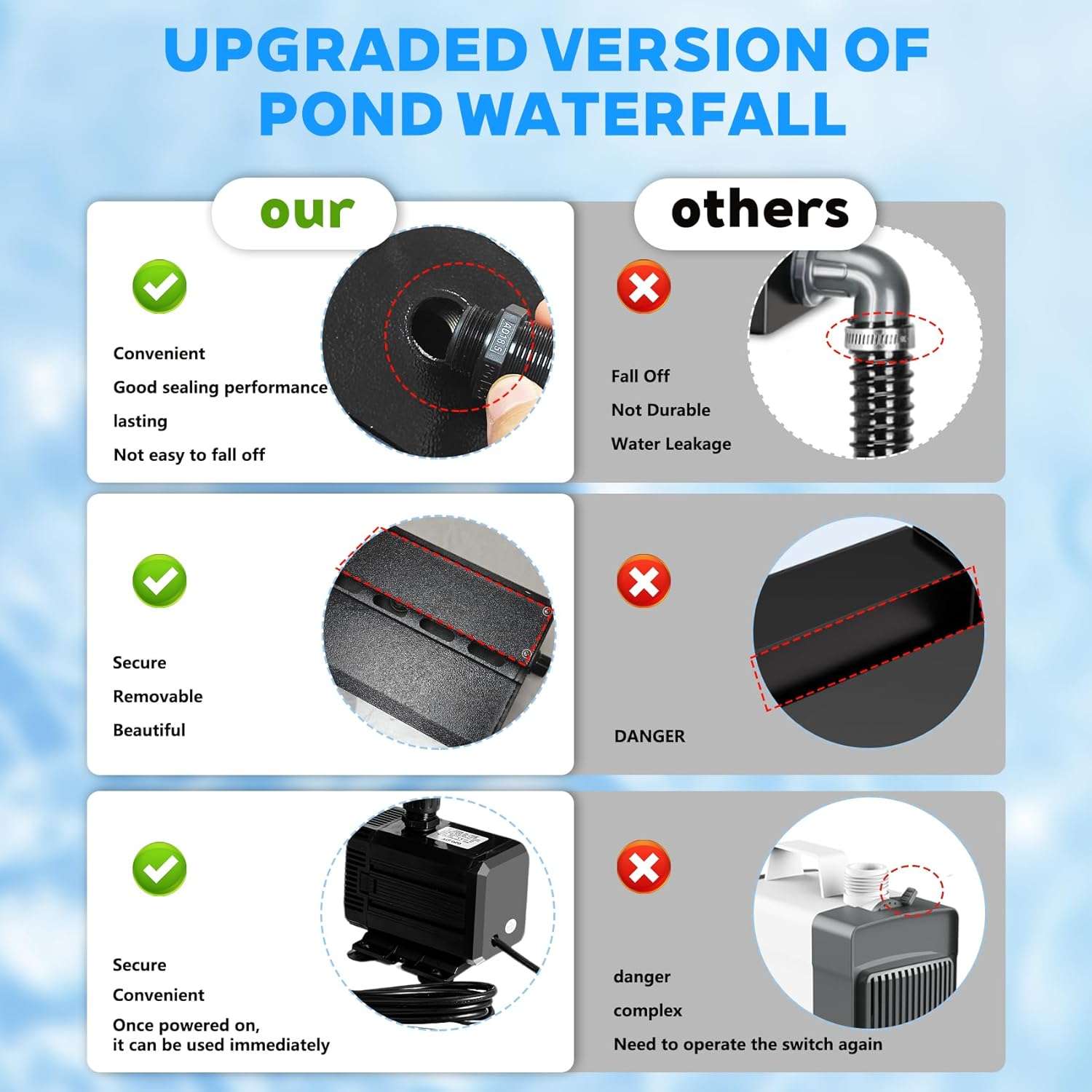 - Easy Installation:Complete backyard waterfall solution:No additional parts needed,Fits most preformed and liner ponds,Just five minutes of use can result in a perfect pond waterfall.