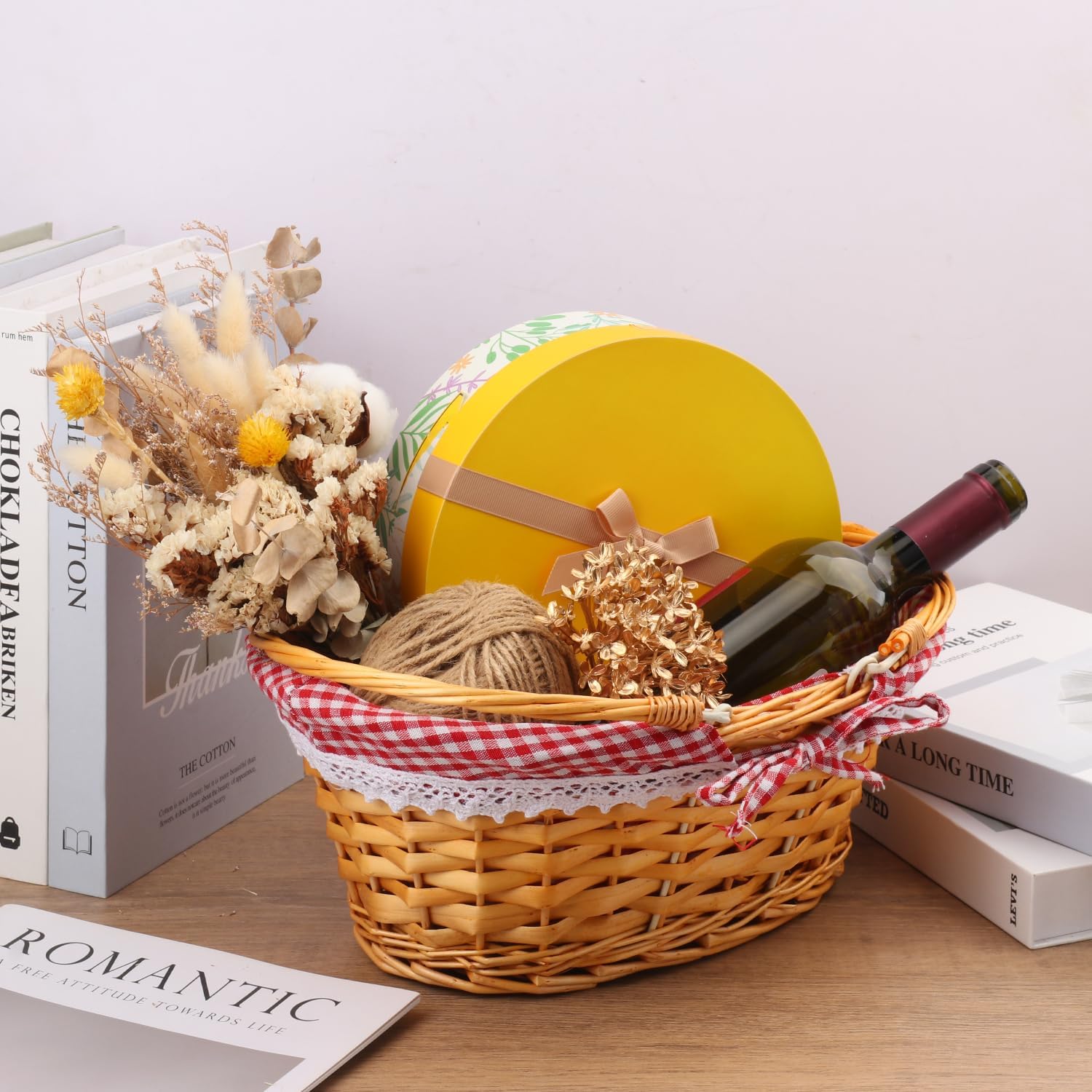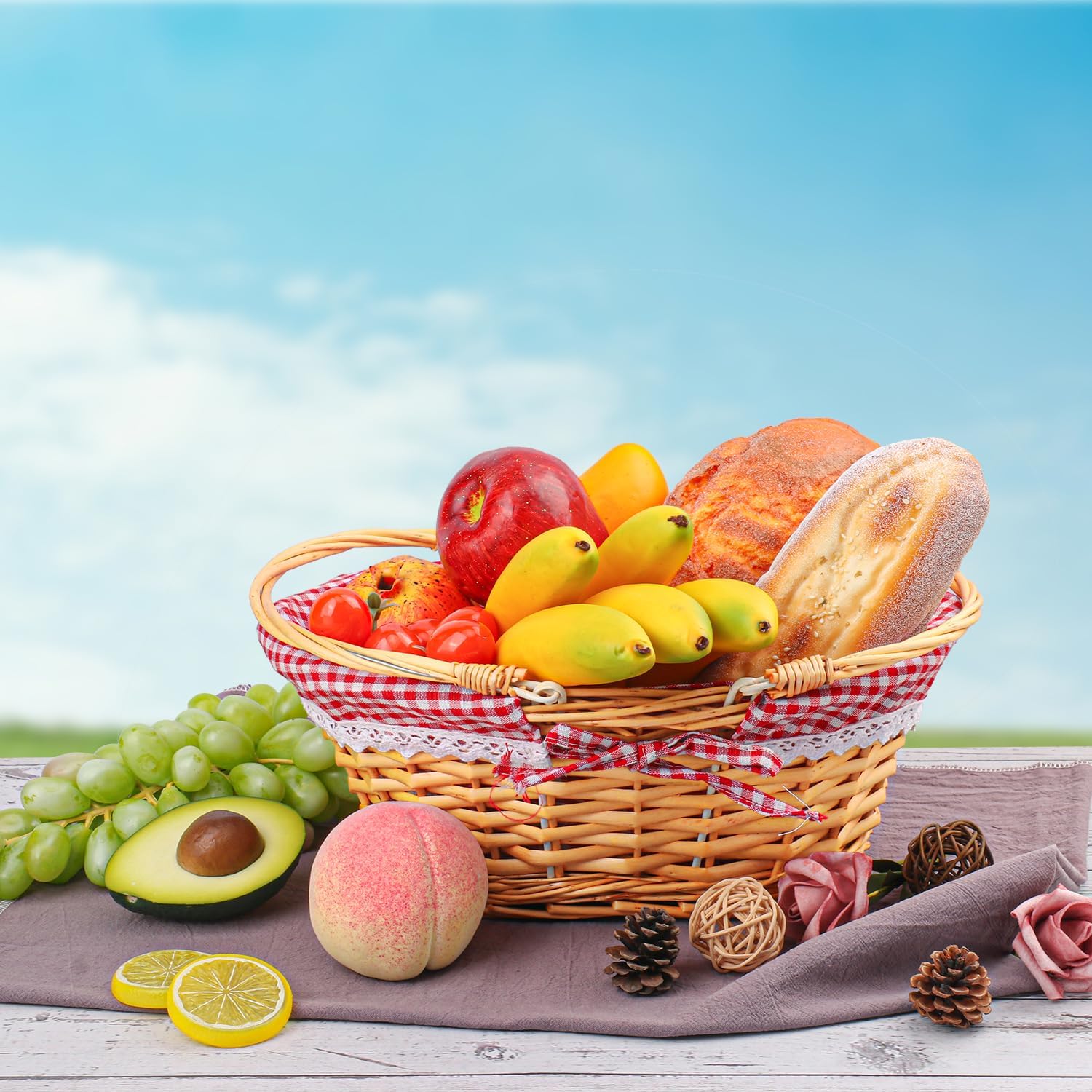 2 Pack 12.6 Inch Natural Wicker Basket with Checkered Lining, Oval Wicker Woven Basket with Handle, Willow Woven Picnic Baskets for Picnic, Camping, Party(Small)