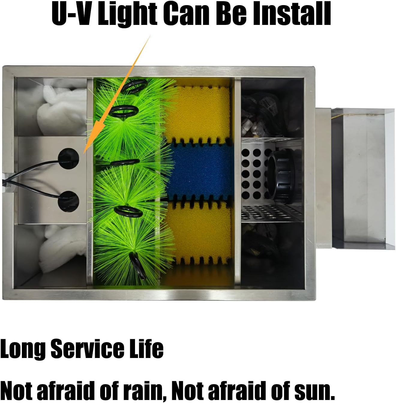 - Stainless Steel Box: long service life. Normal use will not be damaged.Not afraid of sun and rain.Suitable for decorative ponds 300~600 Gallons.The specific volume of use is determined by the cleanliness of the fish pond water.