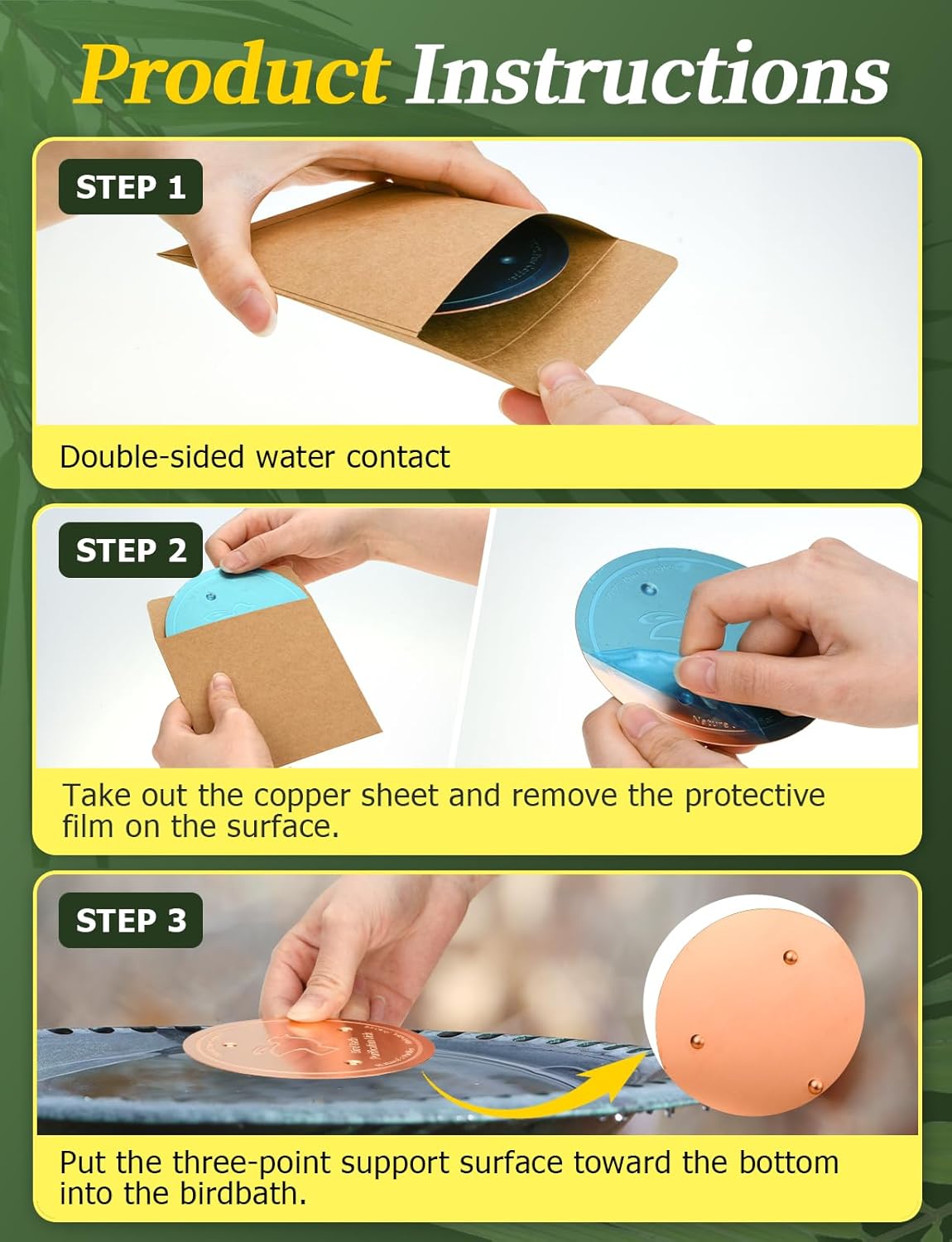 - Effective Design for Maximum Contact: The bird bath copper disk features a three-point support design, maximizing surface contact with the water, keeping your bird bath clean and fresh. Say goodbye to the frequent and tedious cleaning of slimy, green bird baths. With the copper disk, cleaning intervals can extend from approximately every 3 days to about every 20 days, saving you around 120 minutes of cleaning time each month.